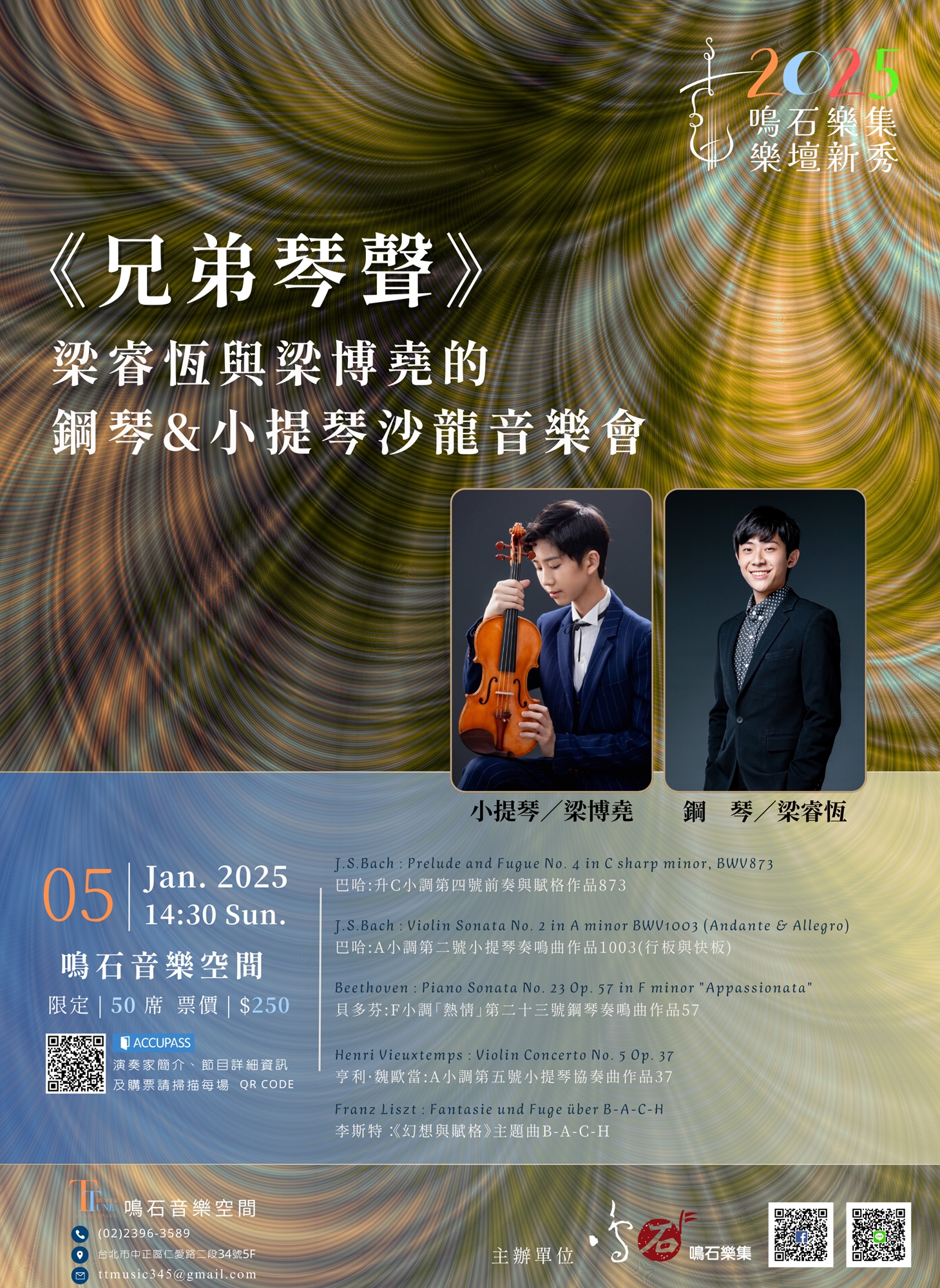 《兄弟琴聲》梁睿恆與梁博堯鋼琴與小提琴沙龍音樂會,兩位兄弟首次攜手,以深厚的兄弟情誼化為音符,帶來一場充滿默契與情感的音樂盛宴。