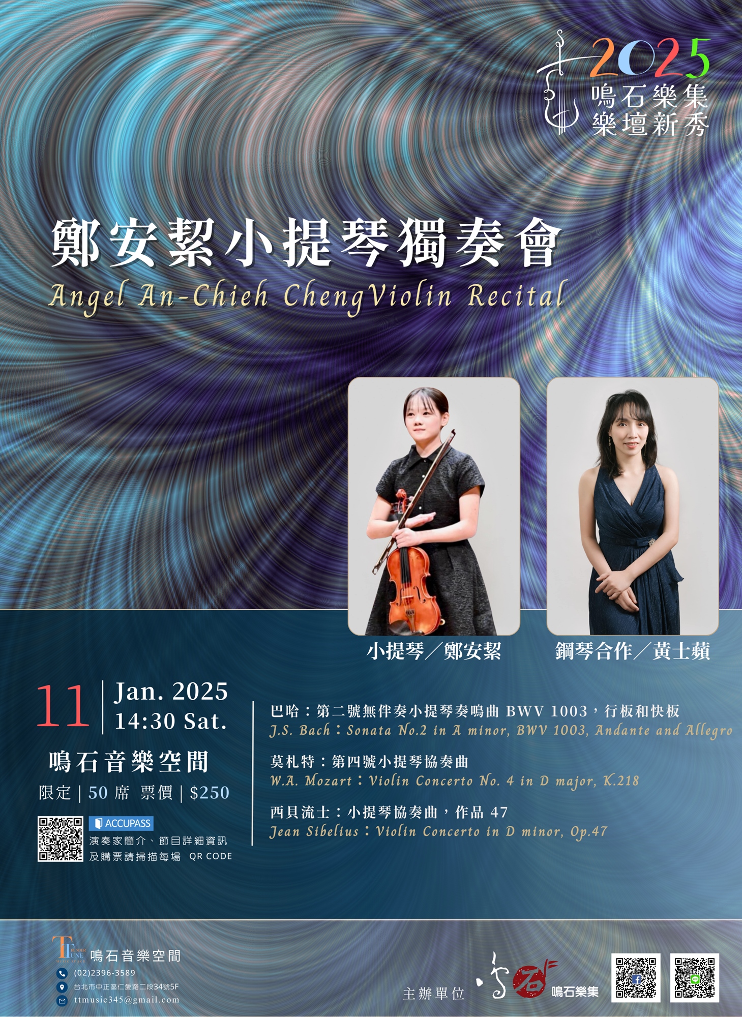 首次獲選鳴石音樂樂壇新秀的小提琴家鄭安絜,這場音樂會將帶來橫跨三個樂派的小提琴經典曲目。包括巴哈(J.S. Bach)、莫札特(W.A. Mozart)和西貝流士(Jean Sibelius), 歡迎來現場聆聽, 一起享受美好的下午~
