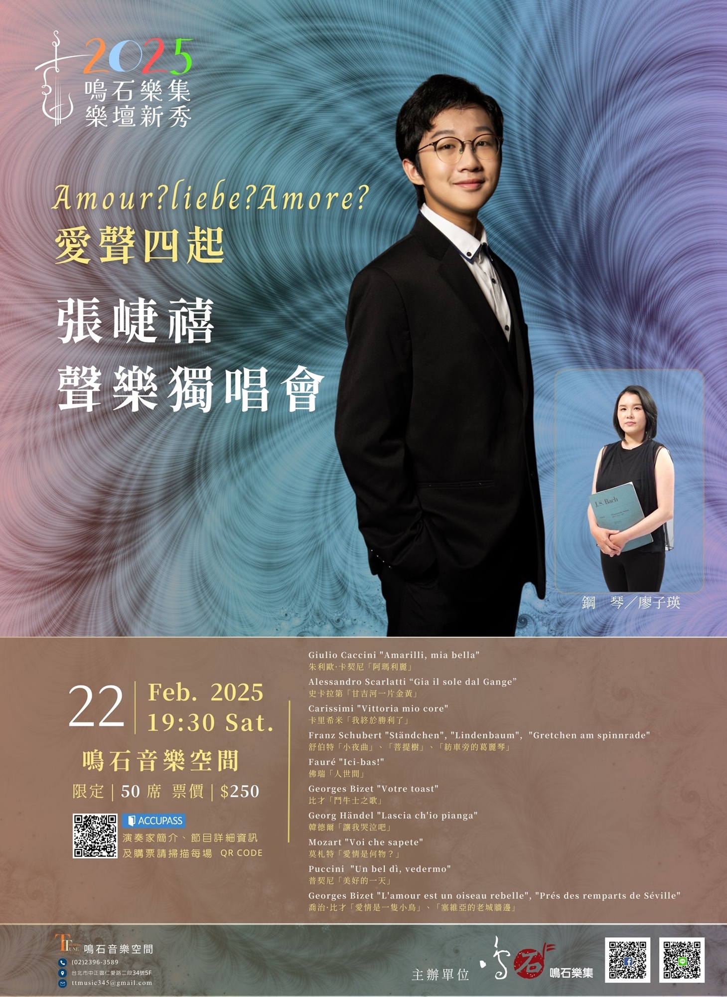 「Amour? liebe? Amore?」我們常說的愛,愛是什麼呢?我想藉由這場音樂會,來尋找愛情的不同面向。 我發現歌劇有個奇妙的定律,就是「無愛不成劇」,我們所熟知的歌劇作品裡有許多都是關於愛情的,不論是什麼時代,愛情總是作曲家和劇作家最愛寫的東西,其中也包含了像八點檔一樣狗血的劇情,還有因愛生恨的恐怖情人,當然也有愛而不得的悲傷與對土地的愛,「愛」這個東西在不同作曲家筆下都有了形狀。 這次的音樂會我選了12首關於愛情的歌曲,其中有舒伯特的藝術歌曲和義大利的民謠,也有不同作曲家的歌劇,希望大家能一起欣賞愛情的不同面向。