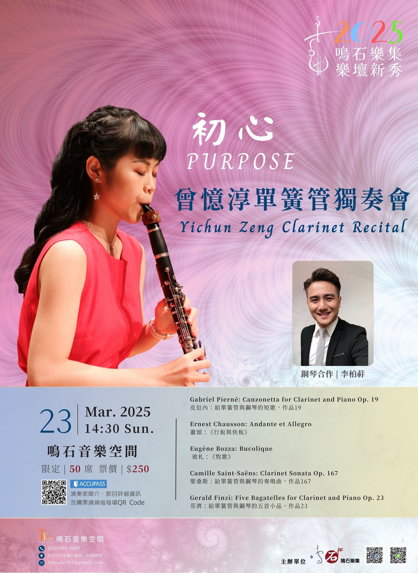 下半場開頭為聖桑斯的單簧管奏鳴曲,聖桑斯在他後期的創作較為傳統,此曲擁有嚴謹的架構,四個樂章也分別呈現出不同的風格。最後一首曲目為芬濟給單簧管與鋼琴的五首小品,芬濟為本場音樂會唯一的英國作曲家。有別於20世紀出現許多較為新穎激進的術語和演奏法,此曲旋律簡樸優美,樂曲中充滿著民歌色彩,並以活潑可愛的風格結束此曲。期待能透過此場音樂會,帶著觀眾一起感受樂曲中豐富多變的和聲及曲風,與觀眾一同徜徉在單簧管的魅力中。