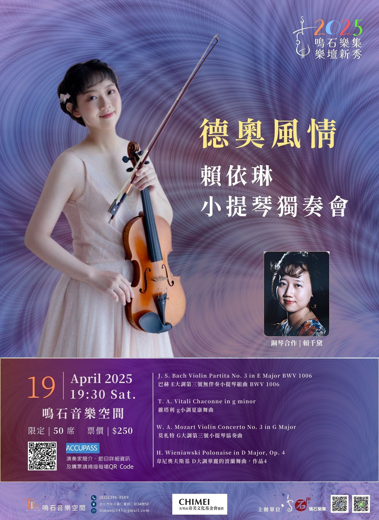 •2024年5月31日於國立臺北教育大學創意館雨賢廳舉行個人畢業音樂會-《賴依琳小提琴獨奏會》獲得熱烈迴響。