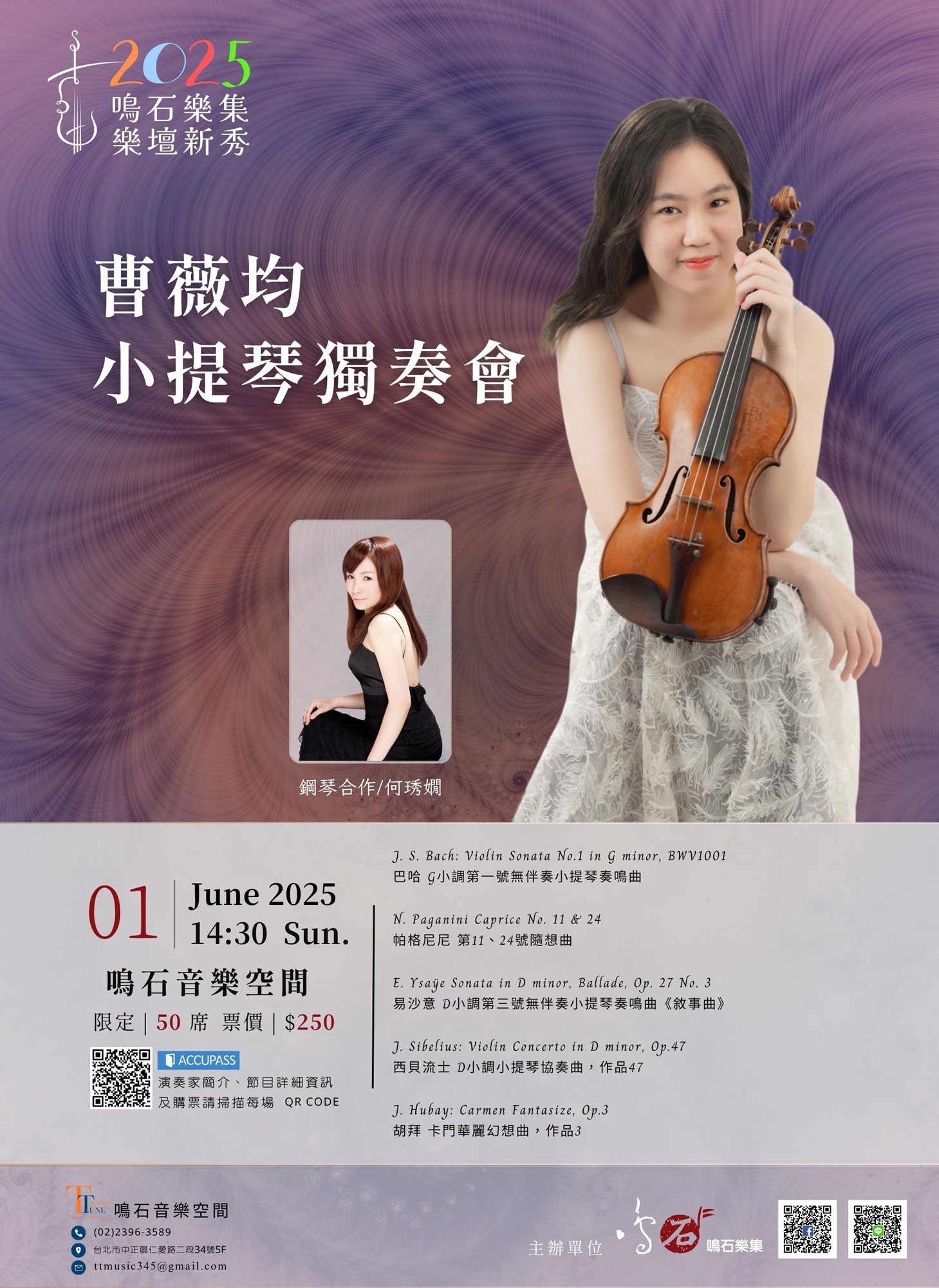 目前就讀楊秀桃音樂學院三年級。此次的演出,從巴洛克到浪漫,她都有鞭辟入裡且無入而不自得的精湛詮釋,曲目包含 巴哈、帕格尼尼、易沙意、西貝流士、胡拜…