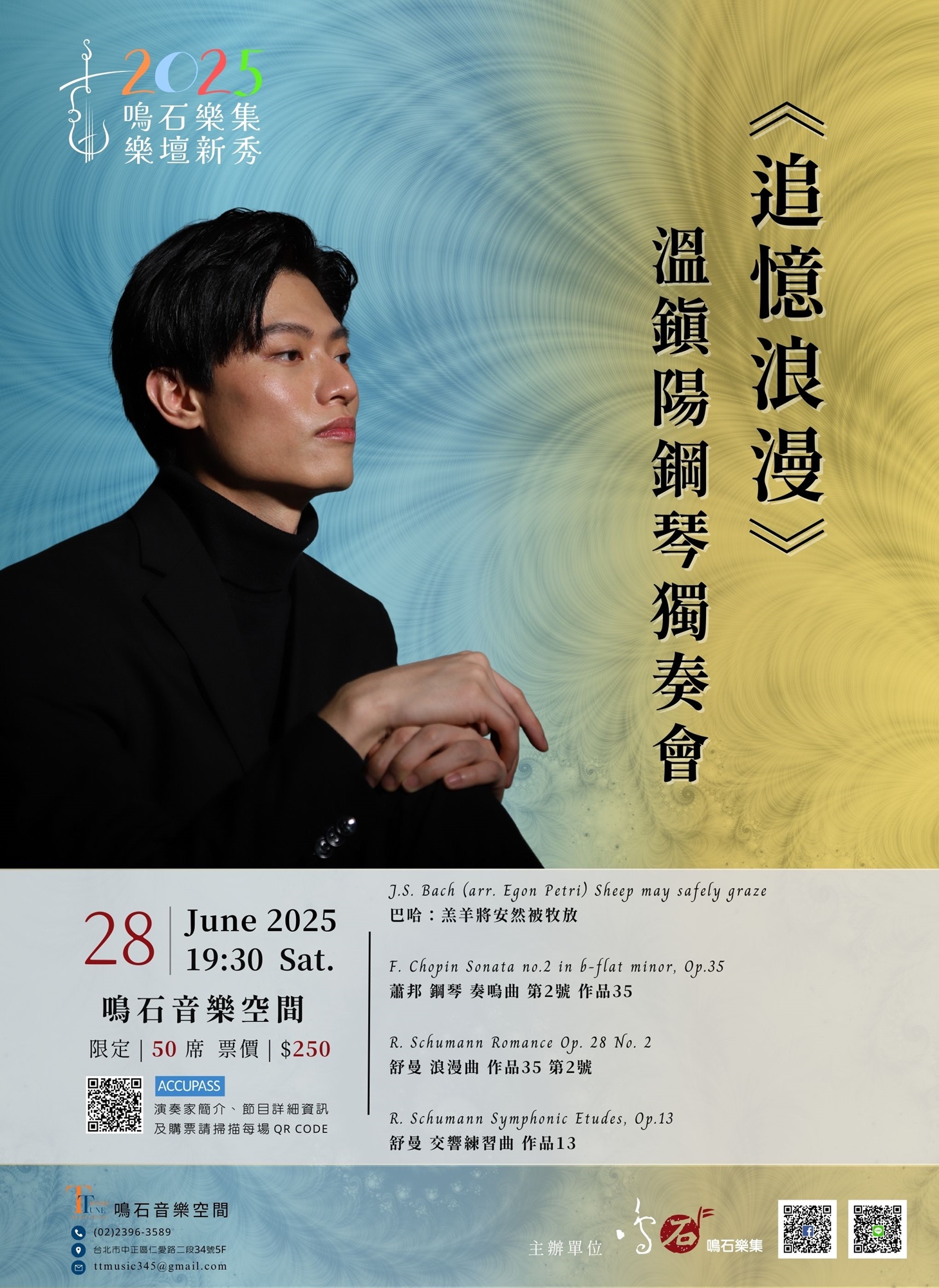 在這場名為《追憶浪漫》的鋼琴獨奏會中,曲目精選自巴赫、蕭邦與舒曼的代表作品,探索鋼琴音樂深刻的浪漫情感。 音樂會以巴赫《善牧羊群》開場,這首作品用虔誠的旋律描繪出一幅寧靜的田園畫面。隨後,蕭邦的《降b小調第二鋼琴奏鳴曲,作品35》將帶入浪漫主義的核心,展現出蕭邦對死亡與命運的思考。 下半場帶來舒曼的《浪漫曲,作品28:第2號》訴說柔美深情的音樂語言,而他的《交響練習曲,作品13》則以技術難度和豐富變奏展現鋼琴的多樣性與豐富表現力《追憶浪漫》不僅是技藝的展示,更是一場情感的交融,邀請觀眾在音樂中追憶浪漫時期兩位巨匠的光輝歲月。