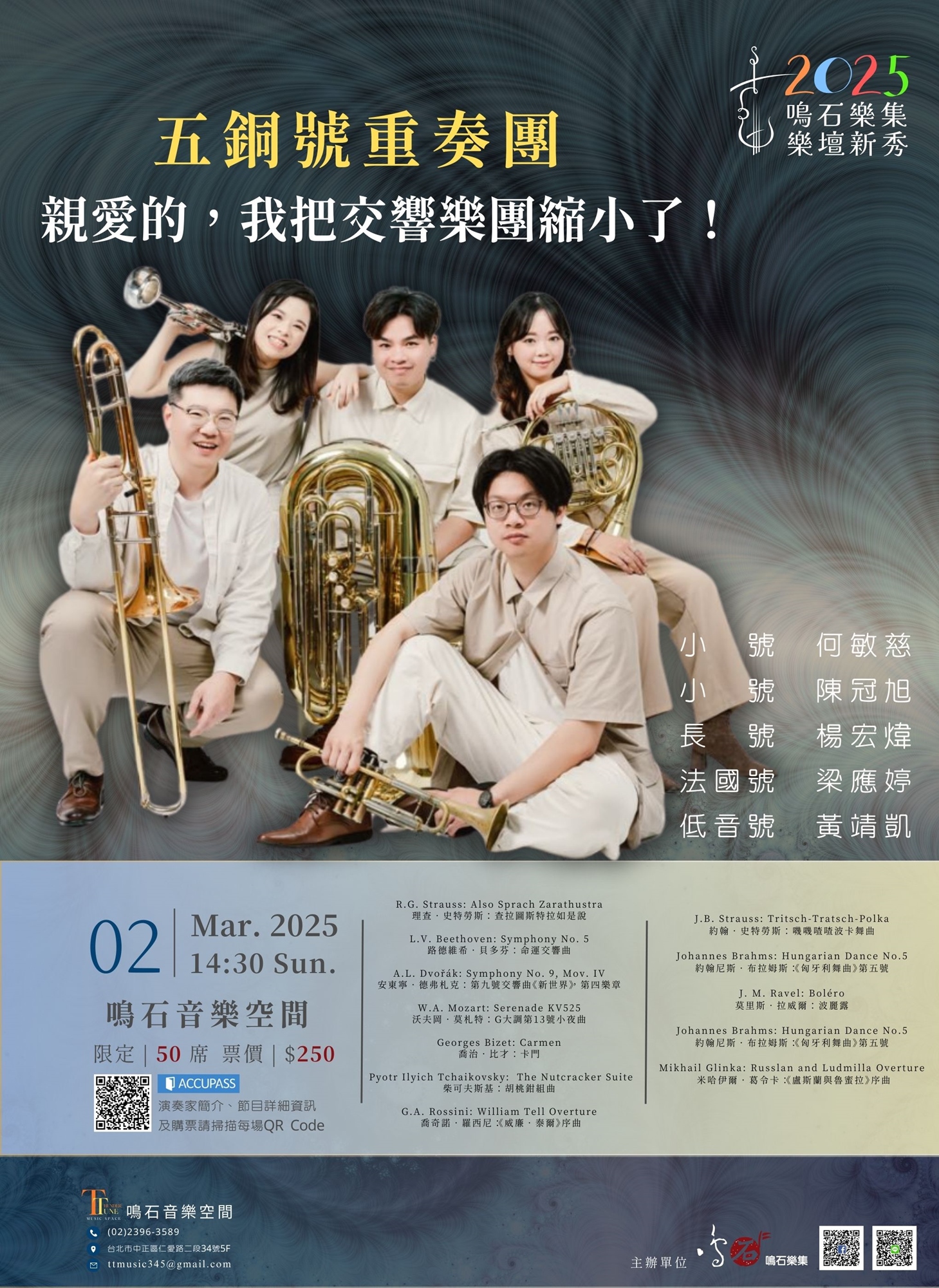 【親愛的,我把交響樂團縮小了!】精選聽眾耳熟能詳的經典管弦樂曲,以銅管五重奏的模式對其進行重新詮釋,將交響樂團完整地搬進鳴石音樂空間,讓聽眾聽到與眾不同的管弦樂曲。 《五銅號重奏團》為臺灣新銳銅管重奏團,成立於2023由國內五位專業的銅管演奏家所組成。以古典樂作為出發點,發展出多樣化的各種曲風,致力於創新不同樣貌的古典樂風,推廣古典音樂文化。