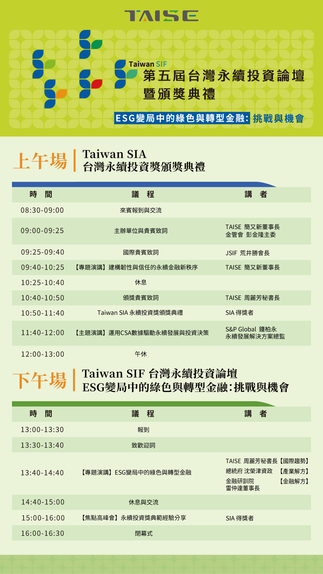 台灣永續能源研究基金會(TAISE)特辦理「Taiwan SIF 2025第五屆台灣永續投資論壇暨頒獎典禮」,旨在提供一個高層次對話與合作平台,邀請各界領袖共同探討如何在ESG變局中把握綠色與轉型金融的新契機,有效動員資本以支持全球永續發展目標。