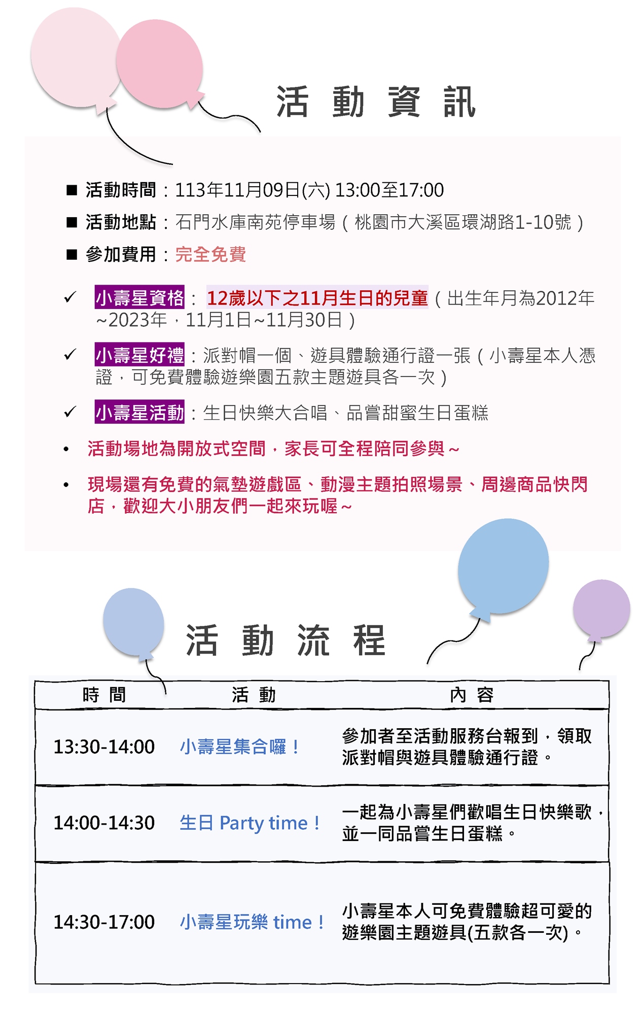 11月生日的小朋友在哪裡~我們一起來場盛大的 Birthday Party 吧!在夢幻的遊樂園中開心玩耍,小壽星可以得到專屬的派對帽、遊具體驗通行證,還可以和大家一起唱生日快樂歌、吃蛋糕!僅此一場的獨家活動!快來創造最特別的生日回憶!就在「2024大龍門鱻漫跑嘉年華」!