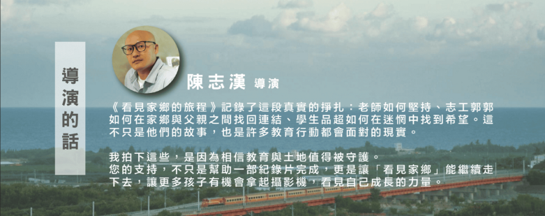 過程中有人成為同行的夥伴,也有人在中途下車,唯一不變的,是「看見家鄉」這個計畫仍然要繼續走下去。導演陳志漢,用鏡頭捕捉了孩子與大人的選擇、矛盾與相互成就。