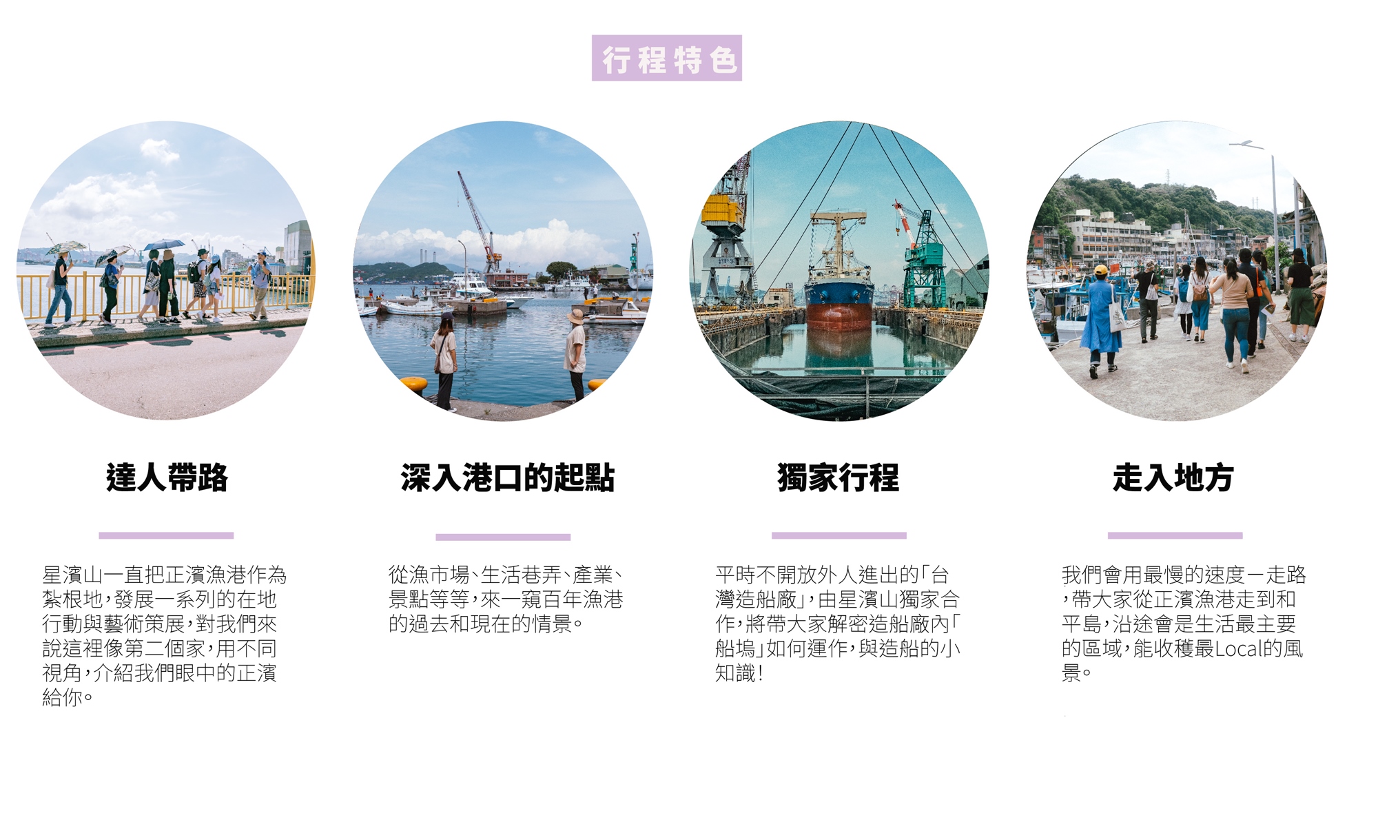 旅程前半段,我們會漫步街區,了解這裡的生活現況,包含彩色屋出現後帶來的影響,和平島上的王爺信仰,以及沿途皆是產業與生活情景相互融合的畫面,適合對港口充滿好奇與熱愛的你。
