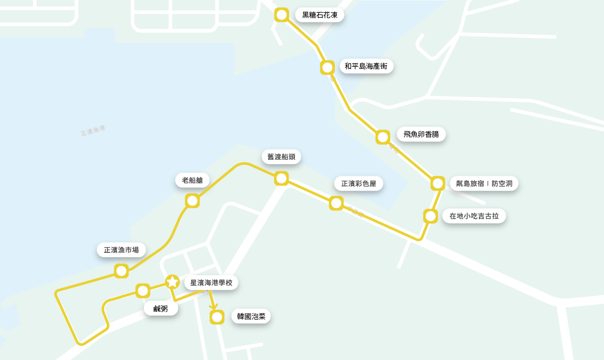 正濱漁港週邊也衍生出許多在地特色小吃,有道地韓國媽媽手工製作泡菜、小魚乾高湯熬煮的鹹粥&道道厲害的小菜們、基隆唯一現場炭烤吉古拉、啵啵啵飛魚卵香腸和阿嬤牌家常味道的黑糖石花凍,邊走邊吃邊聽,幸福就這麼簡單。
