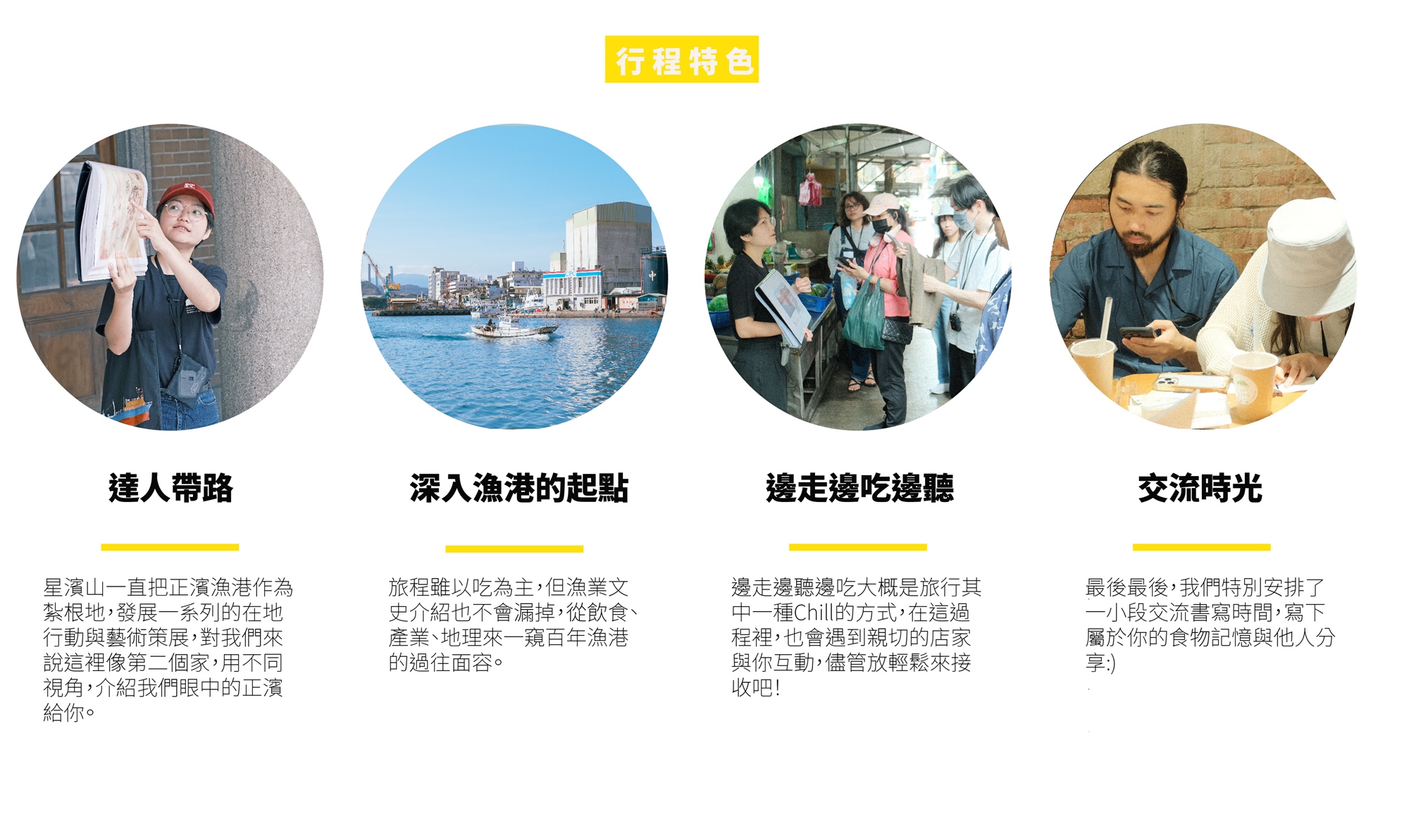 出去玩總少不了對美食的追求,但又不甘於只從google評價、IG打卡去選擇美食嗎?這堂課精選5道正濱在地的巷弄美食:討海人早餐、韓國道地泡菜、特色小吃吉古拉、黑糖石花凍、飛魚卵香腸,並搭配解說導覽,將食物與海港的故事一網打盡。結尾我們將會帶領大家完成一份食物書寫,把一整天的美食記憶帶回家。