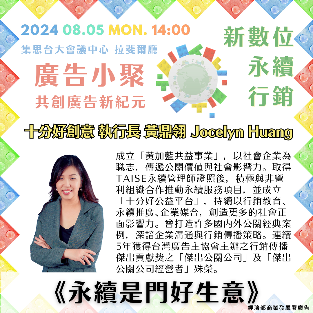 15:30-16:00 | 永續是門好生意 | 十分好創意 執行長 黃鼎翎 Jocelyn Huang |