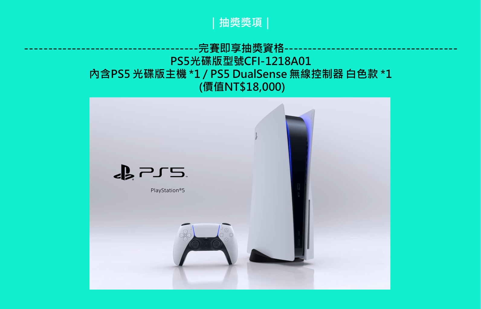 PS5光碟版型號CFI-1218A01:內含PS5 光碟版主機 *1 / PS5 DualSense 無線控制器 白色款 *1 (獎項價值新台幣壹萬捌仟元整)