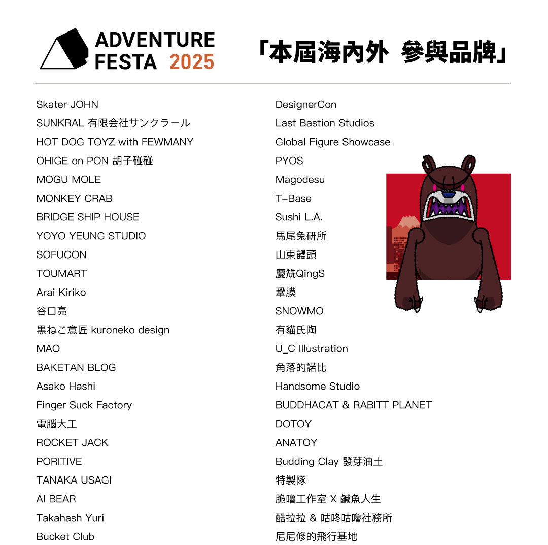 ADVENTURE FESTA (簡稱 AF) 創立自台北,以「原創角色」為核心,透過線下實體博覽會的形式,傳遞原創角色創意在藝術、設計、插畫、玩具與次文化衍生作品的多元魅力!