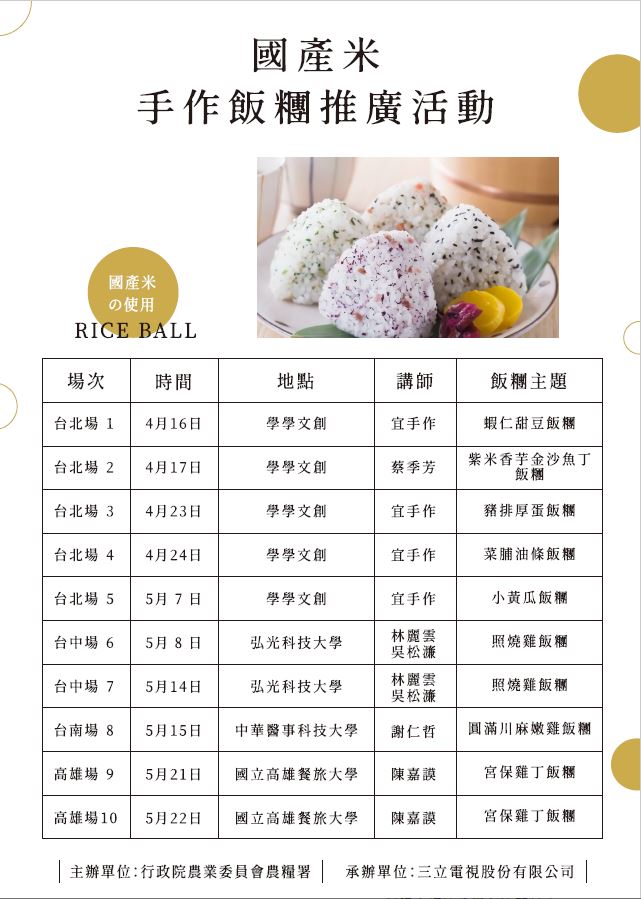 2022年5月21、22日於國立高雄餐旅大學之舉辦「國產米手作飯糰講座」活動延期