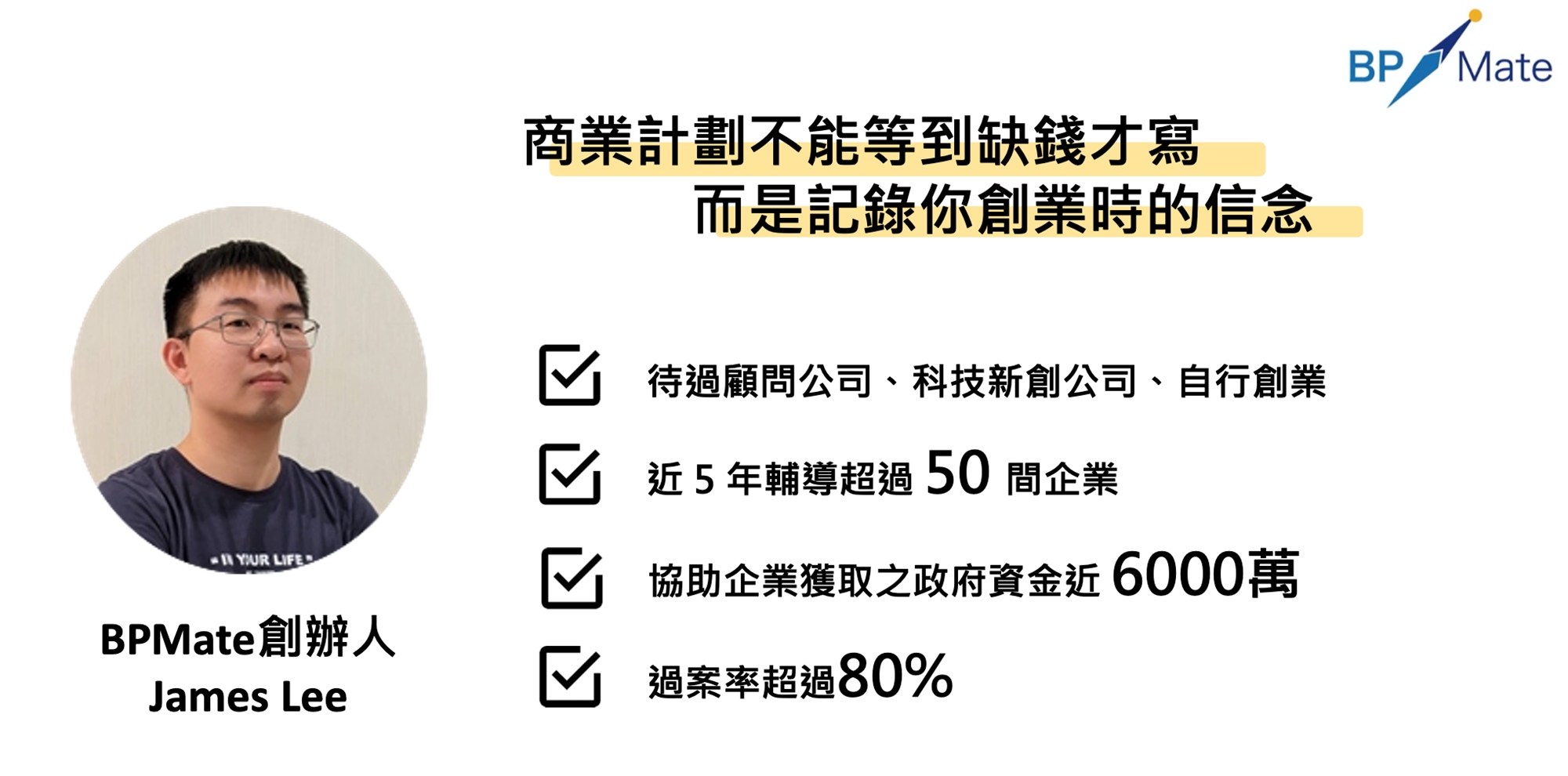 7:30 - 7:50 演講二 『打造高勝率的商業計畫』|James LeeBPMate 創辦人兼執行長