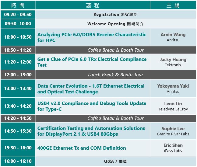 本次由 Anritsu 安立知主辦的【Digital Alliance 數位聯盟夥伴峰會 – 2023高速介面技術前瞻論壇】,特別邀集了 Granite River Labs (GRL)、iPass Labs、Tektronix 以及 Teledyne LeCroy 等業界頂尖夥伴共同與會,分析市場趨勢並介紹高速傳輸 I/O 最新規範,會中將針對其規格與未來的測試挑戰進行介紹,深入剖析高速訊號在時域及頻域所將面臨的訊號完整性問題。豐富實用的課程內容搭配現場實機展示交流,Anritsu 安立知竭誠歡迎您的蒞臨,親身體驗最新最完整的高速介面量測技術解決方案!