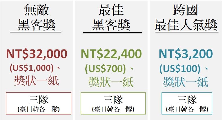 ※無敵黑客獎與最佳黑客獎:本獎項由臺灣主辦單位經濟部工業局、韓國NIA及日本VLED提供各獎項1隊,各國獎金1,700美元(新台幣54,400元)。