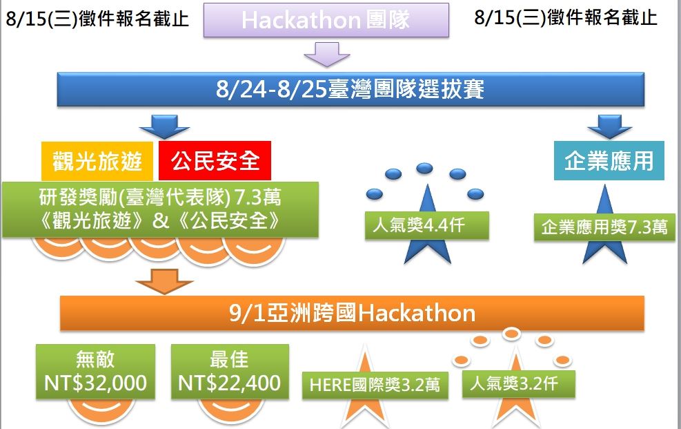 為遴選優秀的團隊展現臺灣開放資料應用實力,特別辦理「臺灣團隊選拔賽」及相關訓練作業,預計經由選拔賽選出5隊團隊,代表臺灣與日本及韓國進行亞洲跨國Hackathon,相關選拔方式及說明如下: