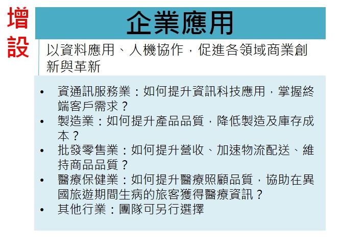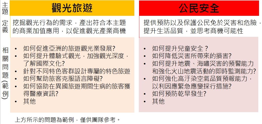 為鼓勵團隊以資料應用、人機協作,促進各領域商業創新,除「觀光旅遊」及「公民安全」外,特別於臺灣團隊選拔賽增設「企業應用」主題,鼓勵團隊運用政府開放資料,協助各產業領域進行商業創新,主題說明如下
