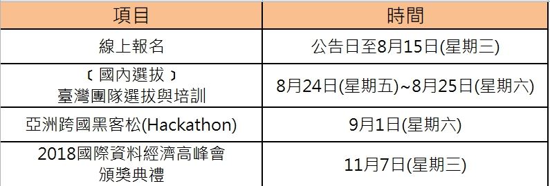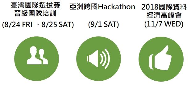 ※8/25晉級團隊之台灣代表隊須配合培訓及完成9/1亞州跨國Hackathon與派代表11/7至韓國參加2018國際資料經濟高峰會方能獲得獎金 。