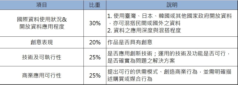 四、報名完成後由執行單位針對報名團隊所繳交的資料進行資格審查,針對「構想說明的完整性(包含問題描述、欲使用哪個國家之資料集項目及解決方案等)」項目審核,至多選出30隊團隊。
