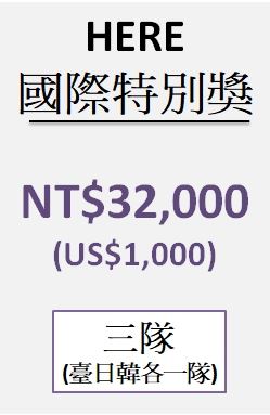※HERE國際特別獎:本獎項由協辦單位HERE Technologies提供;由HERE Technologies獨立評選(已獲得無敵黑客獎、最佳黑客獎及跨國最佳人氣獎之團隊可重複獲獎)。