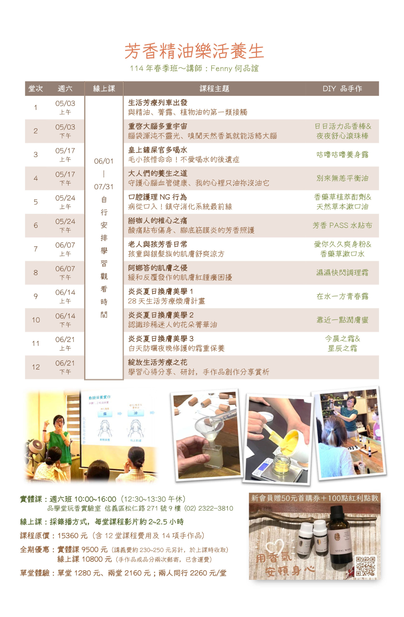 - 芳香精油、七脈輪、身心靈整體健康、芳療防疫、香氣小旅行、新店氣味旅行等活動課程規劃講師