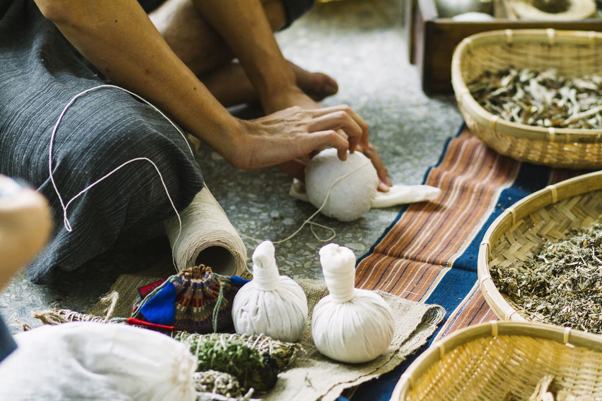 藥草球原為傳統泰式按摩的使用工具,採用新鮮或乾燥草藥,可依使用者體質及需求,調整草藥的組成與比例,再藉由加溫、氣味、接觸和按壓等方式,促進身心的平衡與放鬆。