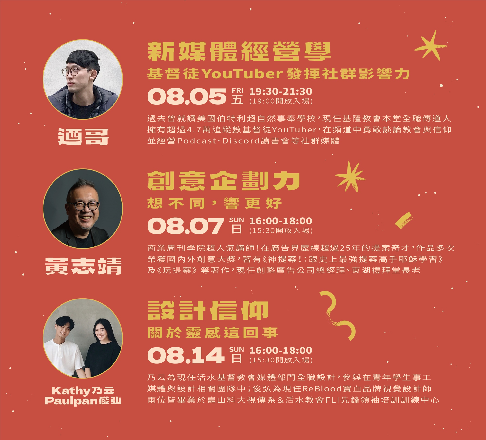 今年八月,四位擁有不同專業與經驗的創意工作者,將從不同的角度出發,一起認識神創造「創意」的美好!讓我們一起來學習,如何在生活與服事中注入創意,讓生活變得更好玩!