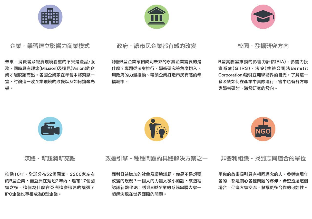 邀請大家參加 8/31-9/1 [B型企業亞洲年會],匯聚30位以上國內外講者,結合聯合國「永續發展目標 SDGs」,分享如何重新定義企業的成功,解決社會的問題,掌握未來企業新樣貌。