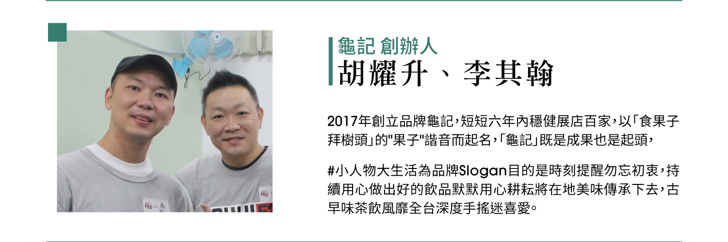 | 13:55-14:40 | 【第四場】龜記創辦人 胡耀升、李其翰 「食“龜記”拜樹頭 」!龜記小人物大生活,如何用台灣古早味,將茶品文化蹦出新滋味 |