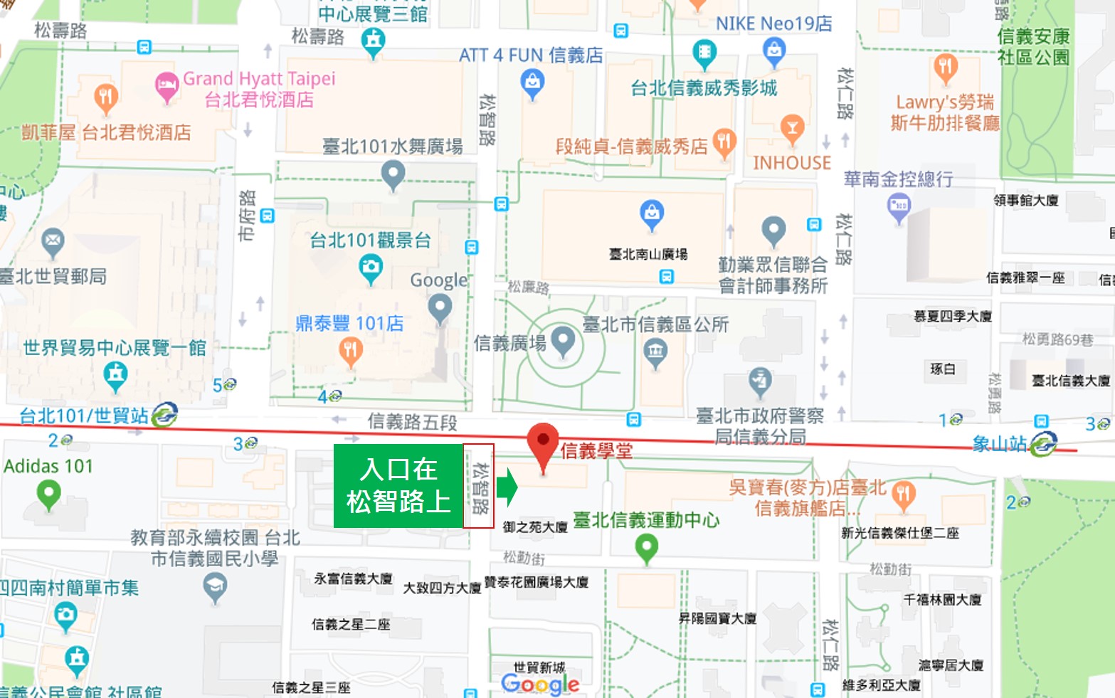 捷運:可搭乘捷運信義線至【臺北101/世貿站】下車(3號出口)