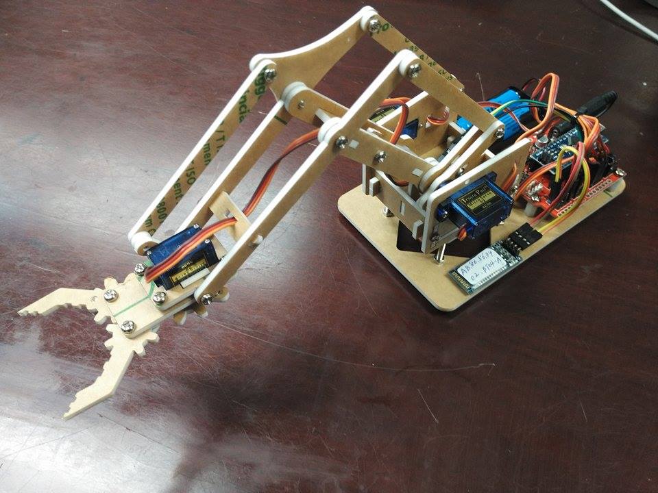 課程進行機械手臂(圖一)製作,教案設計會先介紹機械手臂發展背景,接者會提到其應用與跨領域的結合案例,如,再來會進行工程教學,像是機構的安裝、運作原理與設計的修正等經驗分享,最後會進行程式簡略說明,讓學員了解到如何修改程式參數與調整機械手臂狀況。