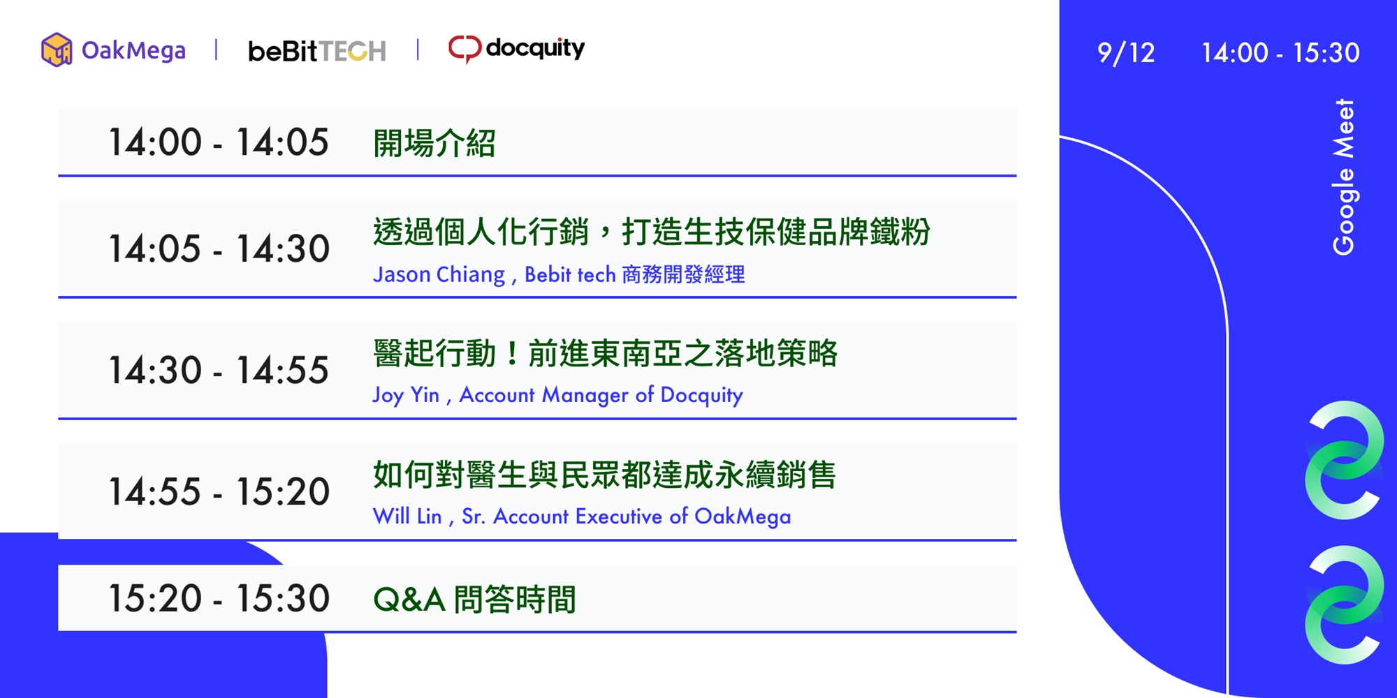 銷售不只是數字遊戲,更是建立信賴的藝術。Will Lin 將分享 OakMega 如何在生技醫療產業內,平衡醫生與民眾的需求,同時保持銷售成果的持續性,在醫生與民眾間建立長久且溫暖的關係。