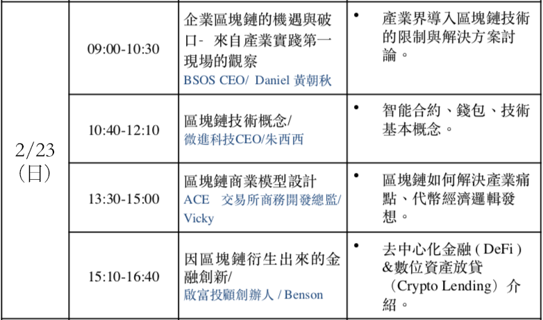 備註:本課程將進行考試認證,考試時間之後將通知所有學員。本訓練課程費用不含[區塊鏈應用規劃師]考試費7000元,以及經考試合格產生之[區塊鏈應用規劃師]年度授權費3000元(需每年繳納續約)