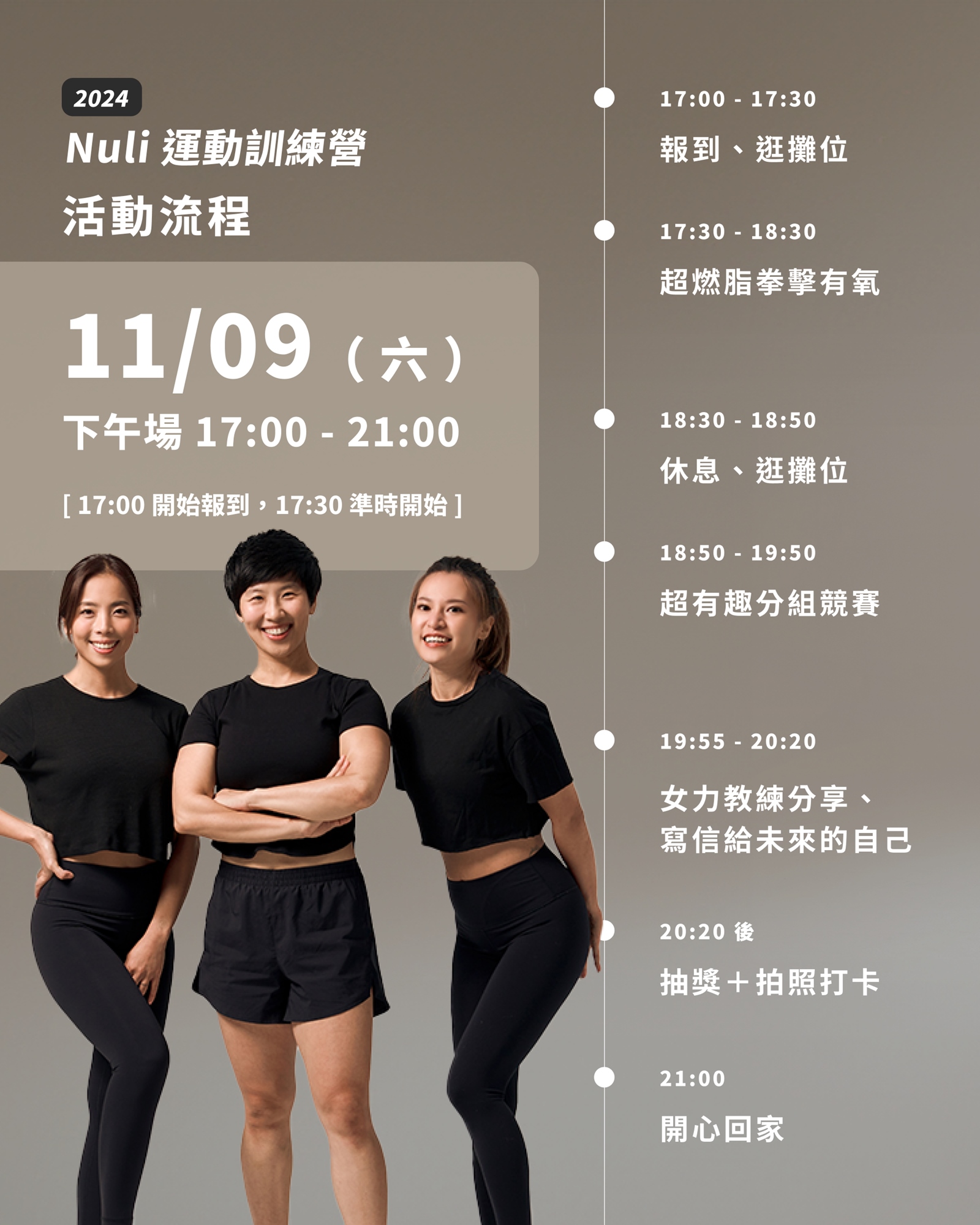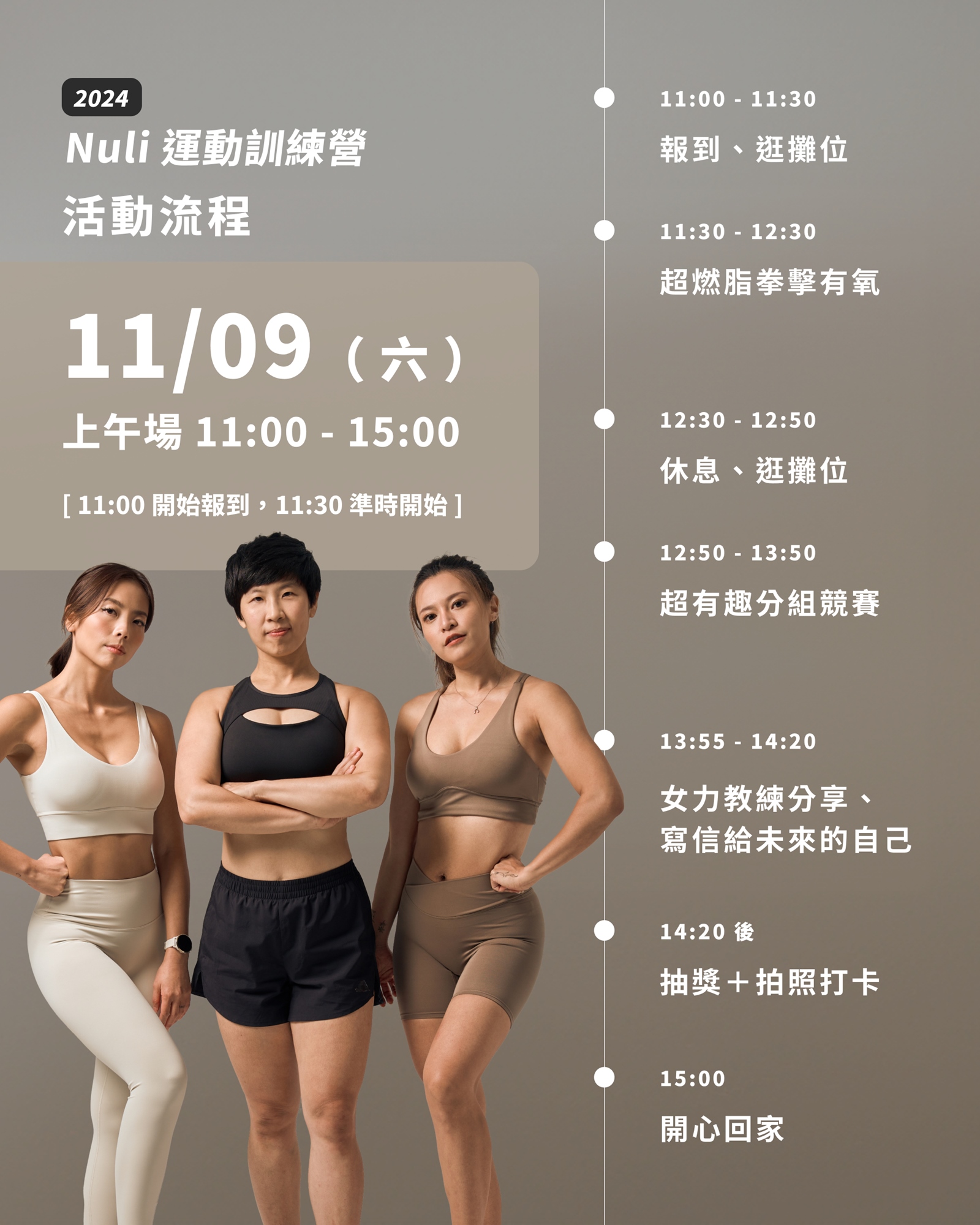 大家超期待的訓練營來啦,平常只能在手機上看到的教練們即將與大家見面,並且帶著大家一起運動!現場還有豐富的攤位可以逛喔!