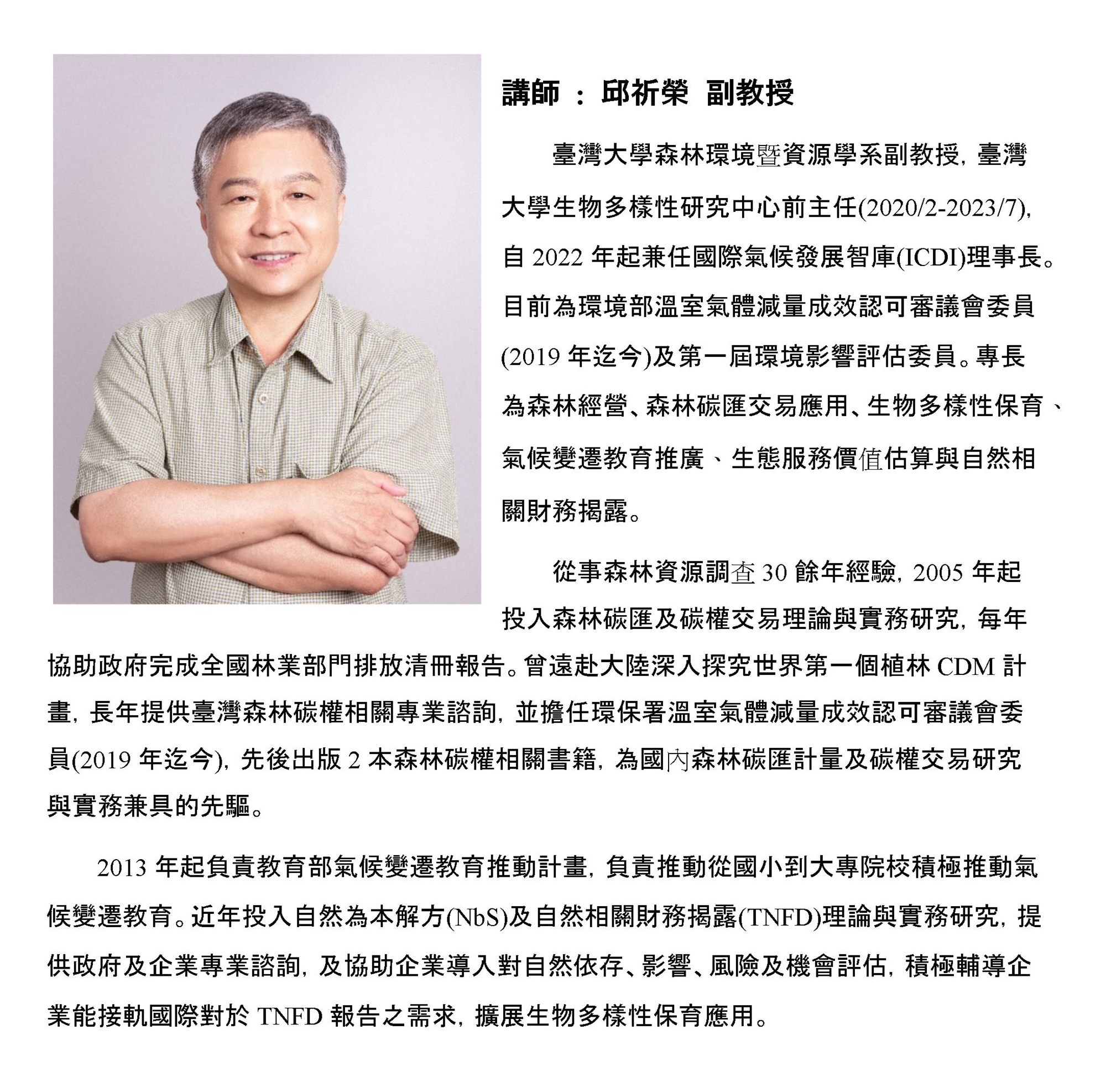 15:35-16:30 | 分享主題 : 企業不可忽視的TNFD 講師 : 邱祈榮 副教授 臺灣大學森林環境暨資源學系副教授 |