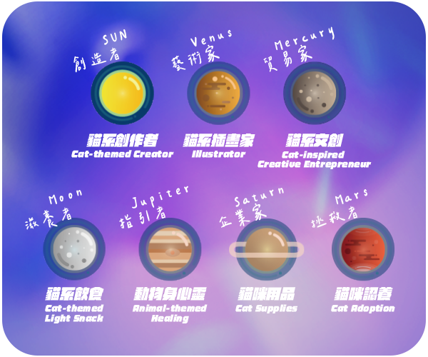 貓星逆行市集運用八大行星的元素,及其於星象學中所代表之意涵融和,為大家帶來專屬貓系人類的創意市集!
