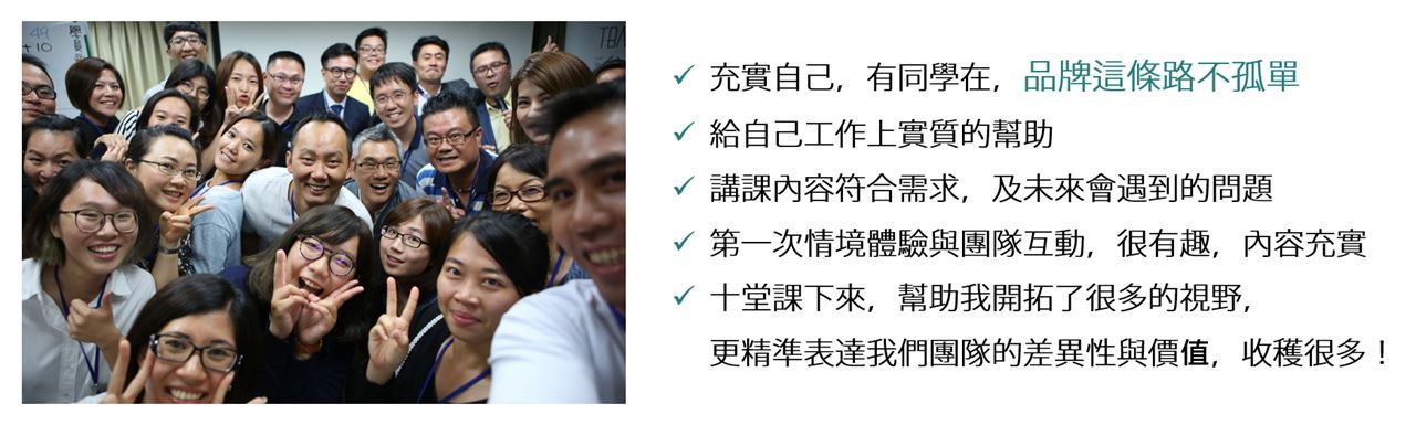 | 招生體驗課 | 課程說明10min 1. 如何建立個人品牌-戴祥恩講師 2. 台灣品牌發展的挑戰與機會-蔡明宏講師 3. 消費者利益定義品牌價值-李定國講師 4. 從創意設計找出產品獨特性-陳進東講師 |