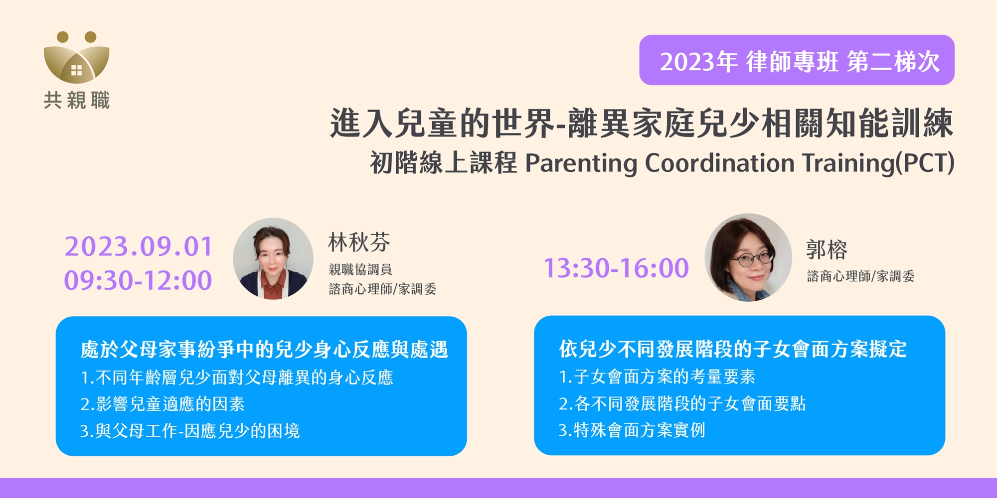 華人共親職中心/花蓮兒家繼2020開辦家事親職協調訓練-律師專班迄今,將於今年首開「離異家庭兒少相關知能訓練之律師專班」,已於5月份辦理第一梯次,將於9月份辦理第二梯次。