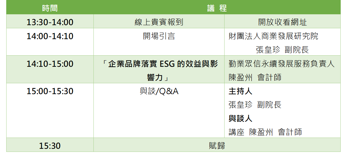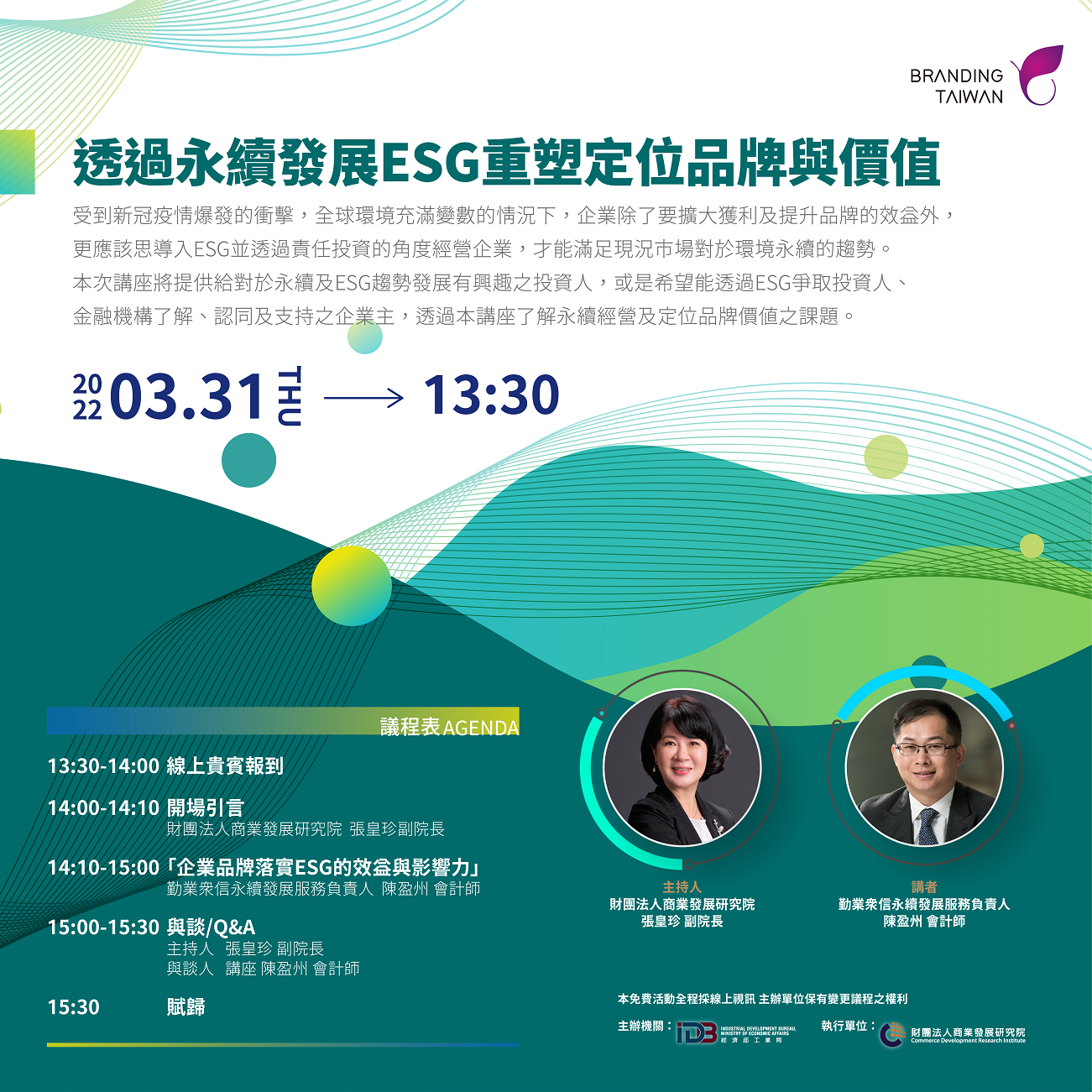 受到新冠疫情爆發的衝擊,全球環境充滿變數的情況下,企業除了要擴大獲利及提升品牌的效益外,更應該思導入ESG並透過責任投資的角度經營企業,才能滿足現況市場對於環境永續的趨勢。本次講座將提供給對於永續及ESG趨勢發展有興趣之投資人,或是希望能透過ESG爭取投資人、金融機構了解、認同及支持之企業主,透過本講座了解永續經營及定位品牌價值之課題。