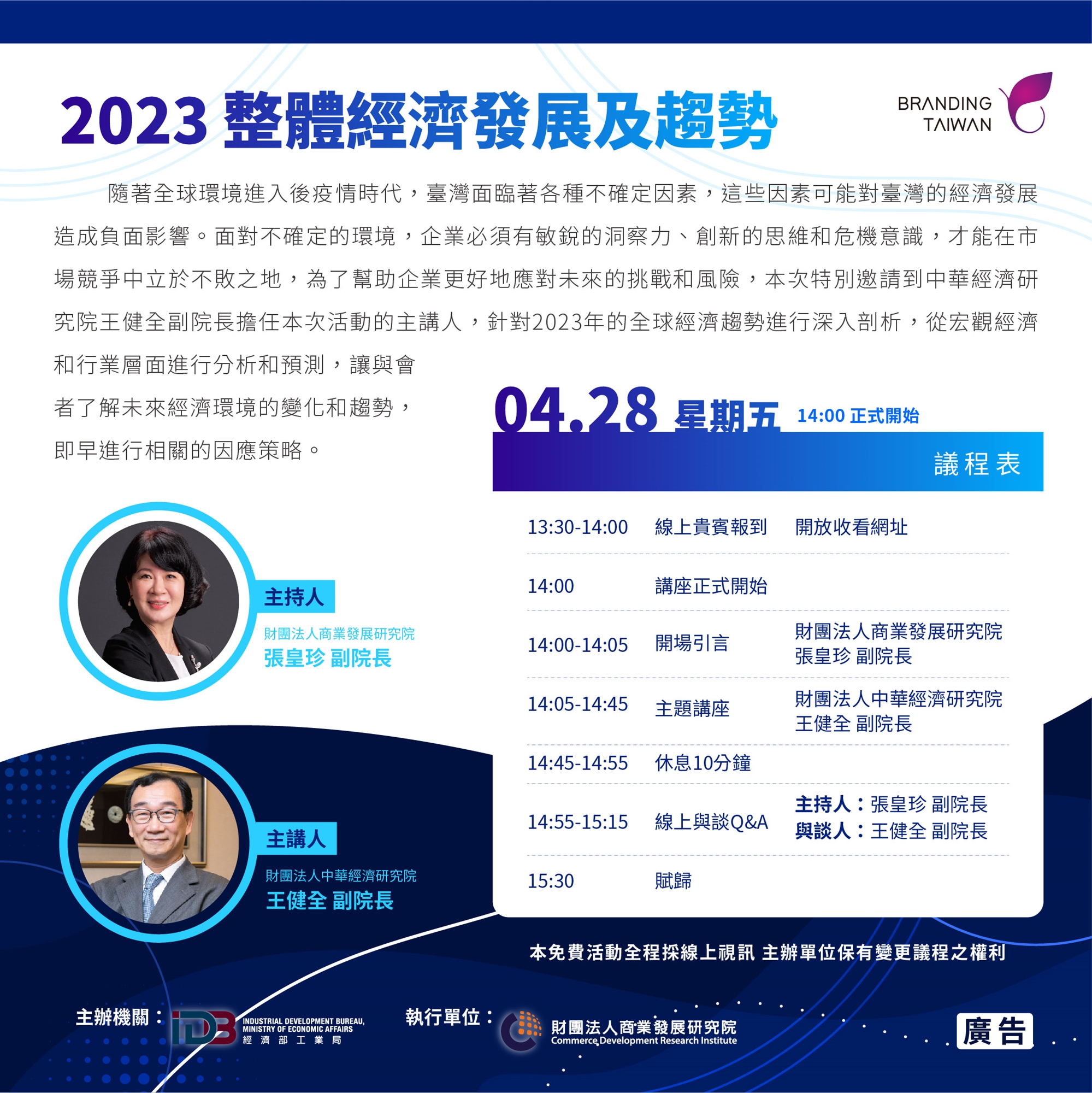 隨著全球環境進入後疫情時代,臺灣面臨著各種不確定因素,這些因素可能對臺灣的經濟發展造成負面影響。面對不確定的環境,企業必須有敏銳的洞察力、創新的思維和危機意識,才能在市場競爭中立於不敗之地,為了幫助企業更好地應對未來的挑戰和風險,本次特別邀請到中華經濟研究院 王健全副院長擔任本次活動的主講人,針對2023年的全球經濟趨勢進行深入剖析,從宏觀經濟和行業層面進行分析和預測,讓與會者了解未來經濟環境的變化和趨勢,即早進行相關的因應策略。