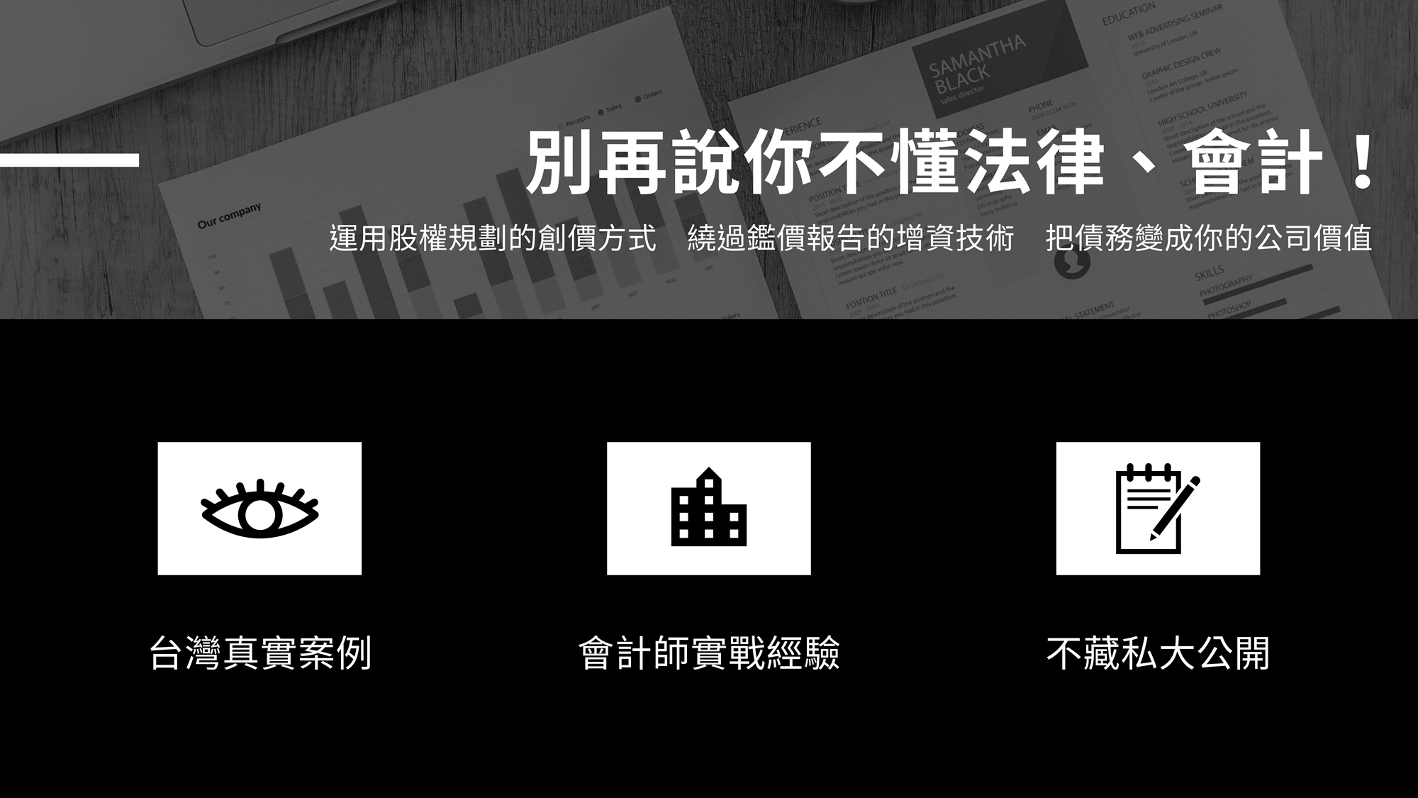 對於創業者、投資人,除了看到創業的產品、營收,莊世金教練要幫你從會計師的角度、從輔導過的各種台灣創業案例,一起看到「創造價值(創價)」這件事,也包含整合公司許多不同的資源。運用股權規劃的創價方式!繞過鑑價報告的增資技術!把債務變成你的公司價值!