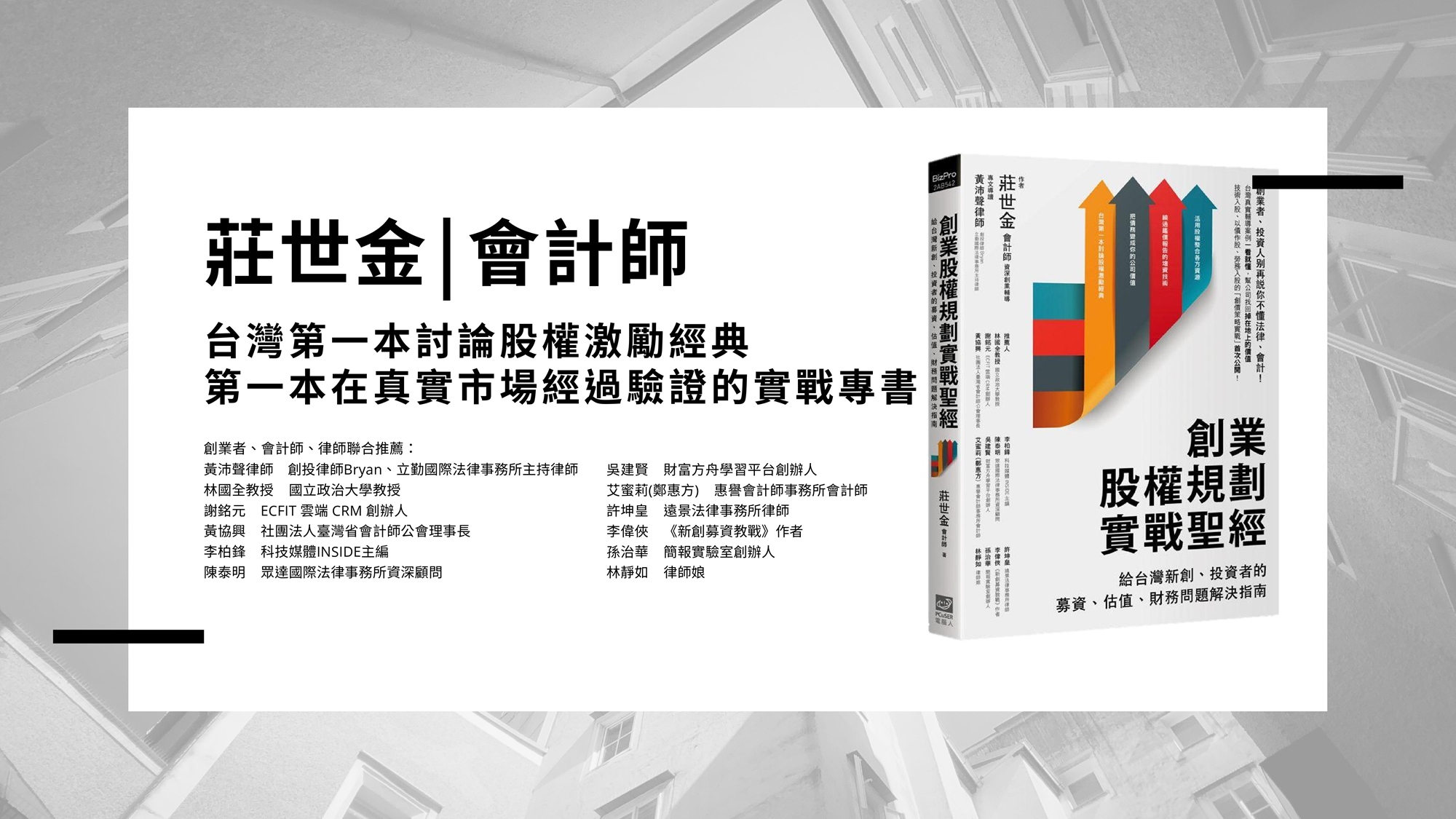 台灣第一本討論股權激勵經典,也是台灣第一本在真實市場經過驗證的實戰專書,博客來商業理財類熱銷書籍《創業股權規劃實戰聖經:給台灣新創、投資者的募資、估值、財務問題解決指南》作者。