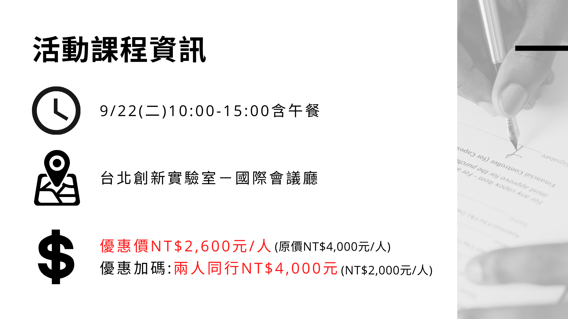 費用:原價NT$4,000元/人,優惠價NT$2,600元/人。優惠加碼,兩人同行NT$4,000元(NT$2,000/人)