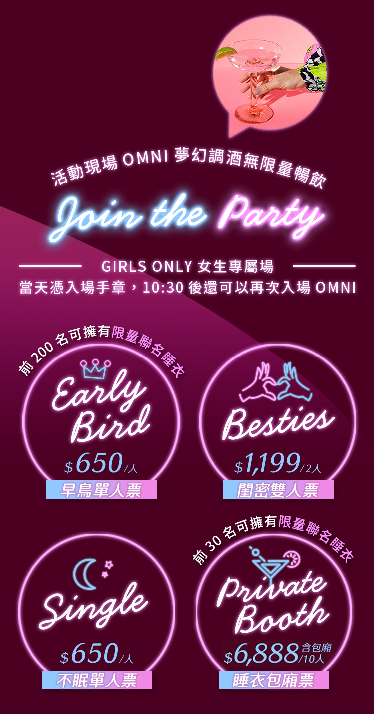 - 參與本活動需為女性且年滿十八歲者,請攜帶身分證眀文件。未滿十八歲者及非女性,主辦單位有權限制入場,並無法提供退票服務。
