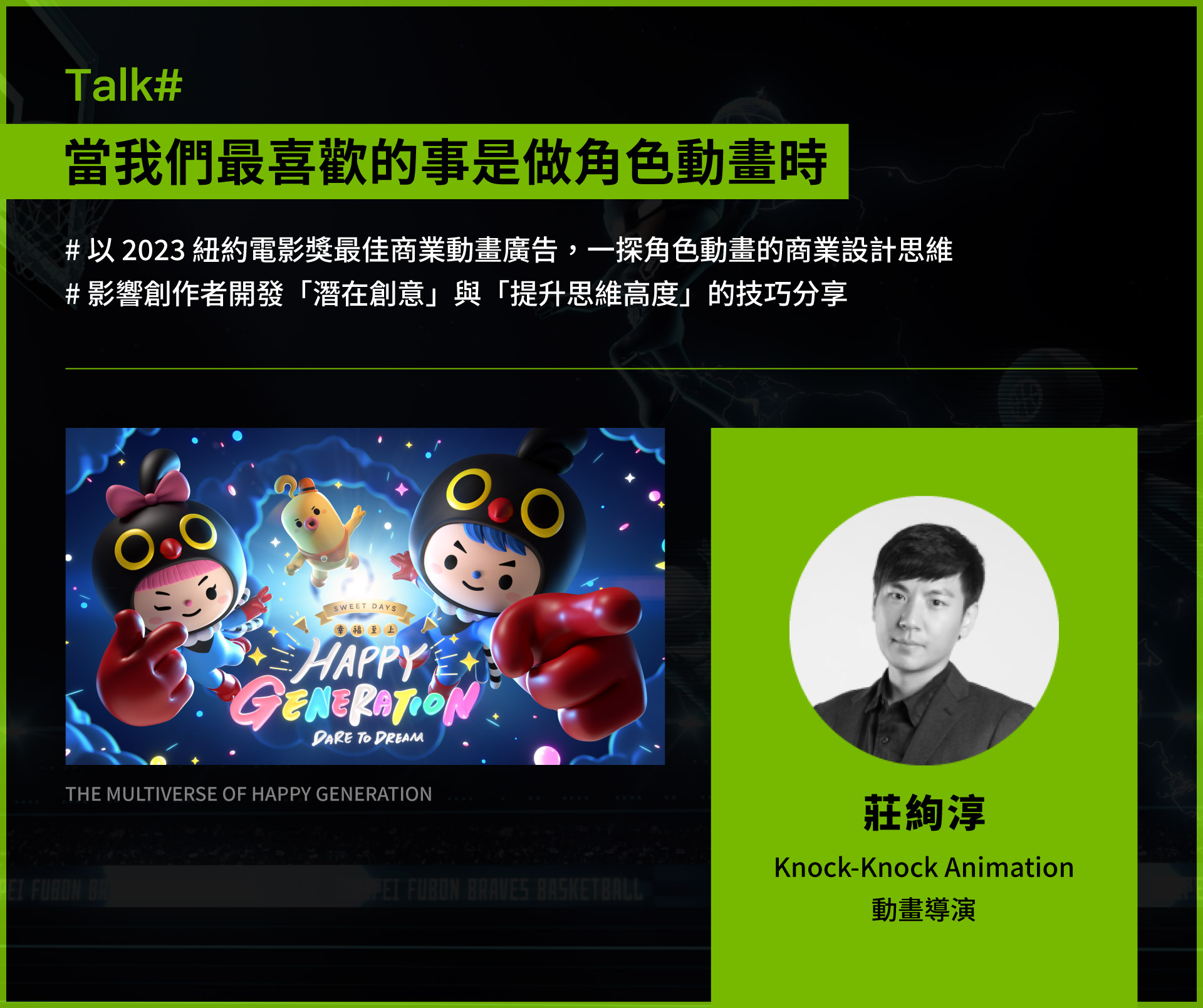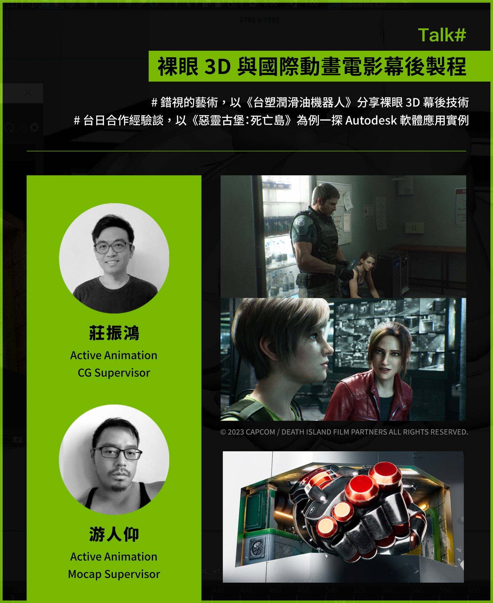 活動中將邀請四位傑出的產業人士,為您帶來獨家的行業知識。Knock-Knock Animation 將以 2023 紐約電影獎最佳商業動畫廣告《THE MULTIVERSE OF HAPPY GENERATION》,從概念發想、角色設計到幕後製作,進入充滿可愛視覺的多重宇宙。Active Animation 將以裸眼 3D 動畫與台日合作的電影《惡靈古堡:死亡島》,深入了解 Autodesk Maya、Motion Builder、Arnold 與 Shotgrid 的實戰應用,洞悉團隊專業的精湛技藝。