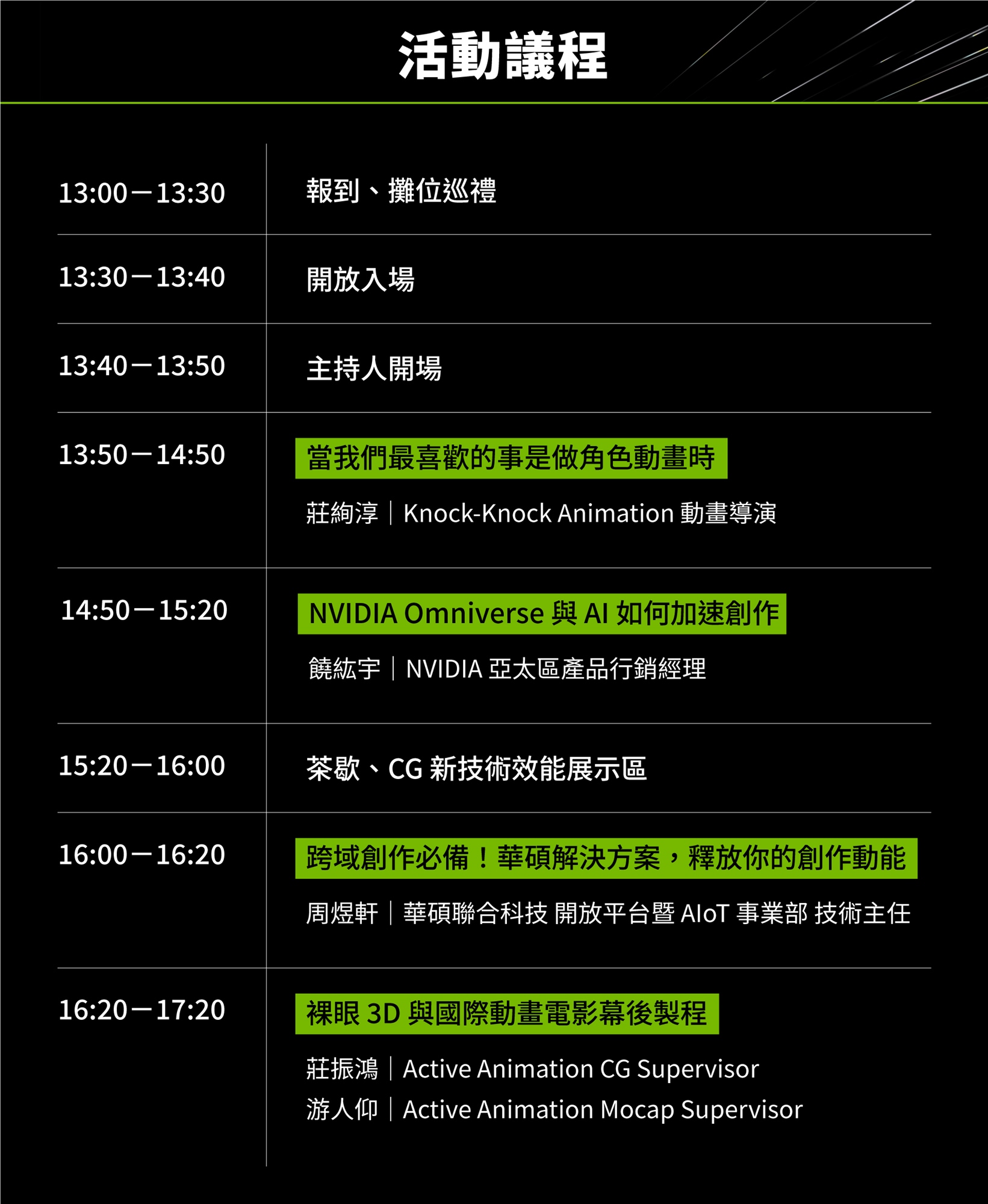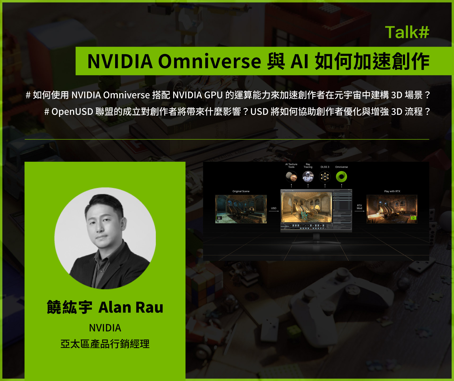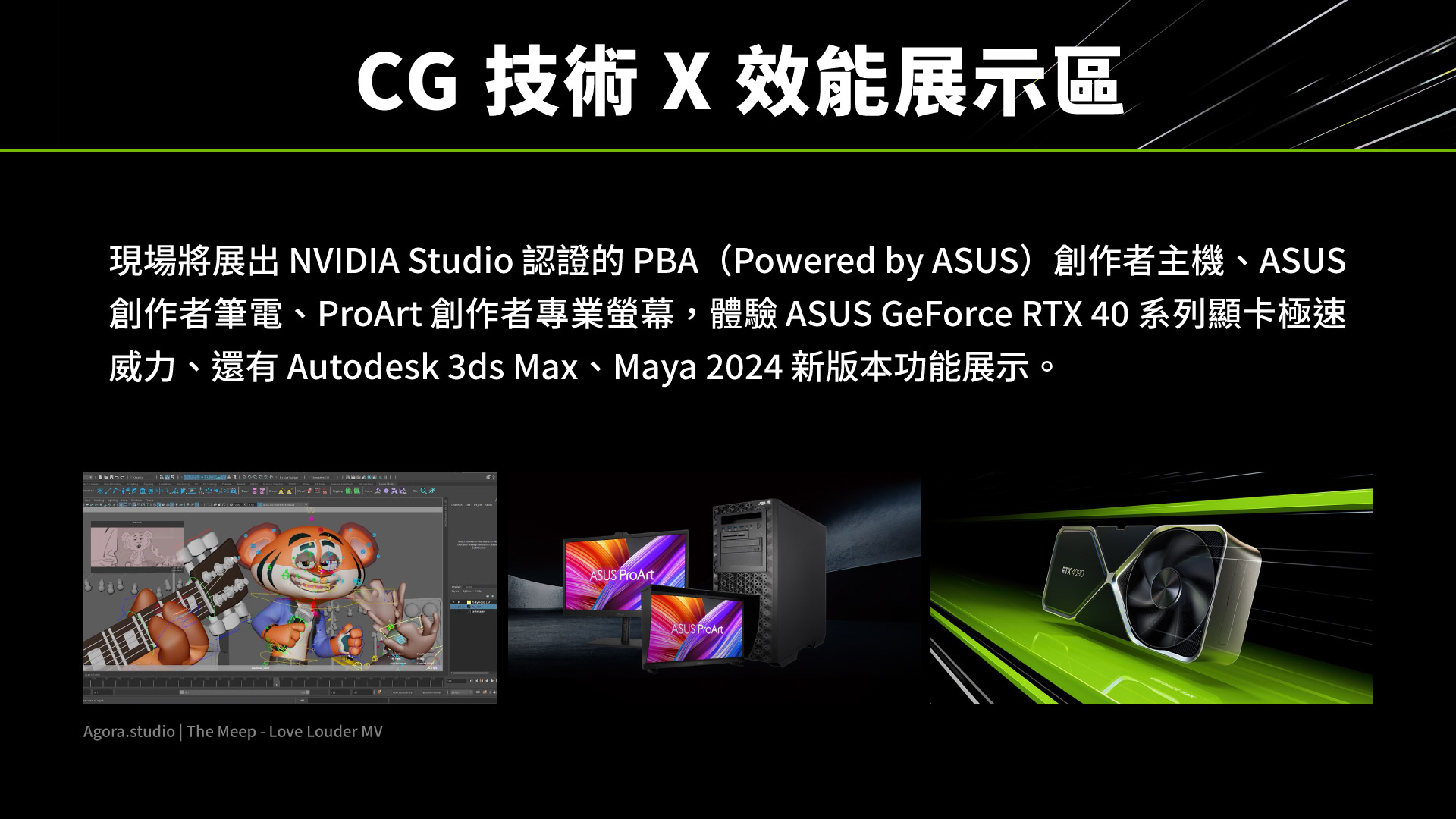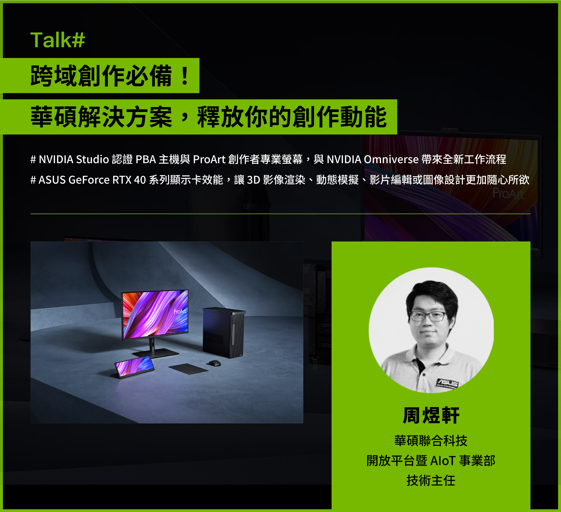 此外,NVIDIA 與華碩電腦也攜手展示全新的 3D 創作趨勢。從 NVIDIA Omniverse 強大 GPU 運算力,到跨時代 USD 工作流應用,透過 NVIDIA Studio 認證的 GeForce RTX 40 系列 PBA(Powered by ASUS)創作者主機與 ProArt 創作者專業螢幕,讓 3D 影像彩現、動態模擬、影片編輯和圖像設計更加高效靈活,加速實現卓越的創作成就。精彩活動不容錯過,快與我們一同解鎖精彩專案的幕後故事。
