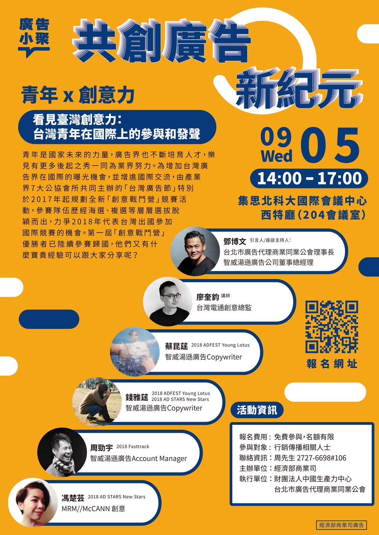 與談人: TAAA理事長 鄧博文 台灣電通創意總監 廖奎鈞 智威湯遜廣告Copywriter 蔡昆莛 智威湯遜廣告Copywriter 錢雅莛 MRM//McCANN 創意 馮楚芸 智威湯遜廣告Account