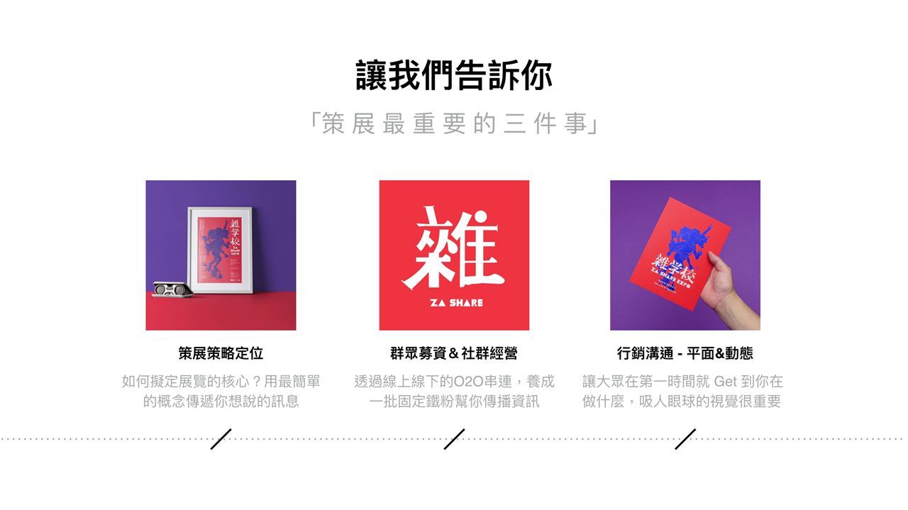 由雜學校創辦人用實際經驗告訴你點子從哪裡來、如何將點子化成實體。並邀請業界最專業的講師,告訴你如何與大眾溝通、經營社群,以及你所需要具備的行銷及設計概念,再由雜學校的策展人帶你實際經歷一次如何策展。